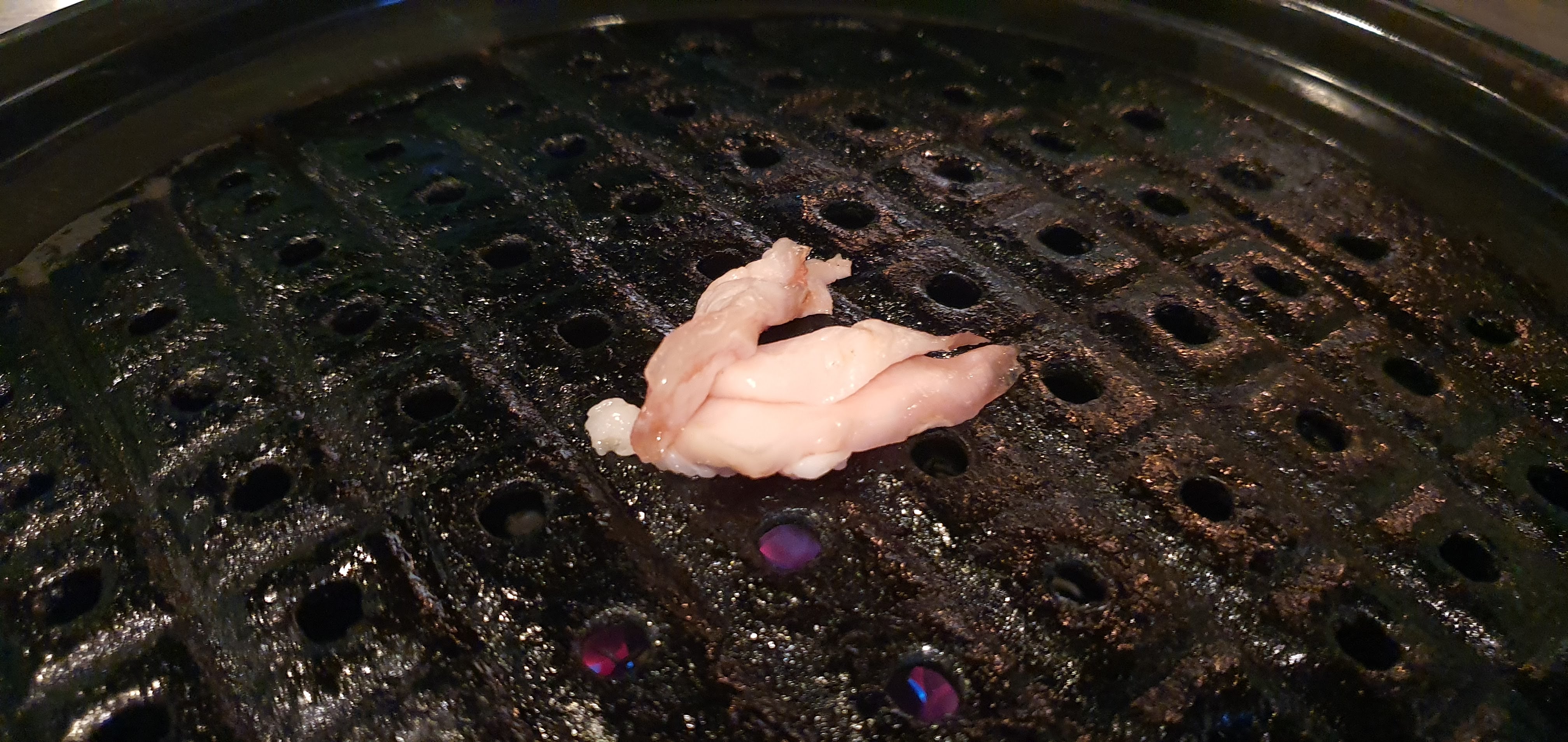 껍데기를 시키면 일단 불판 위에 고기 조각을 불판에 올려놓고 기름이 끓으면,