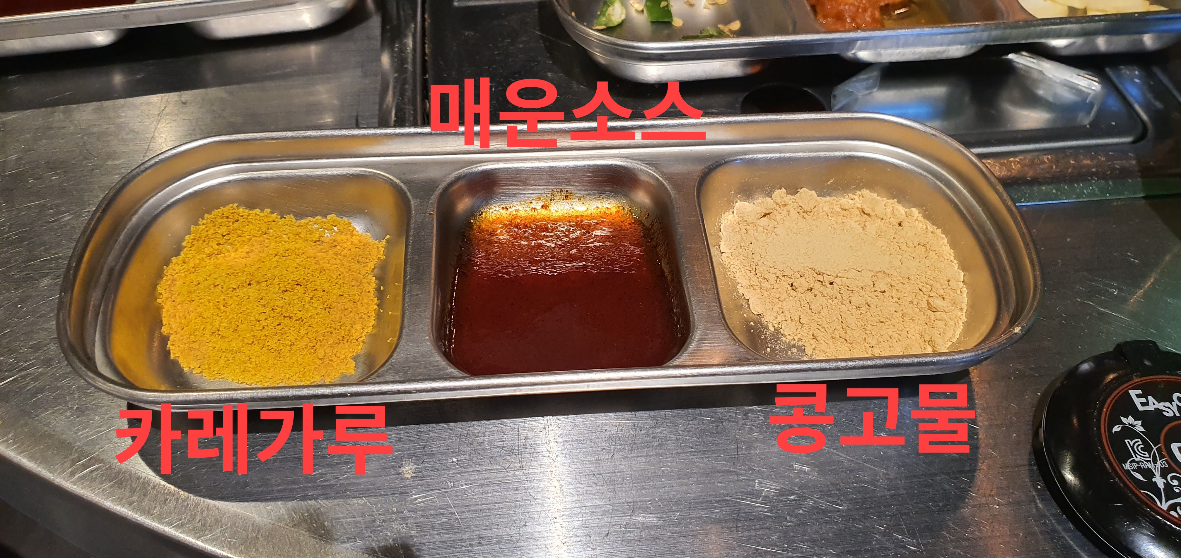 개개인의 카레 가루, 매운 소스, 콩고물 세 가지 소스와