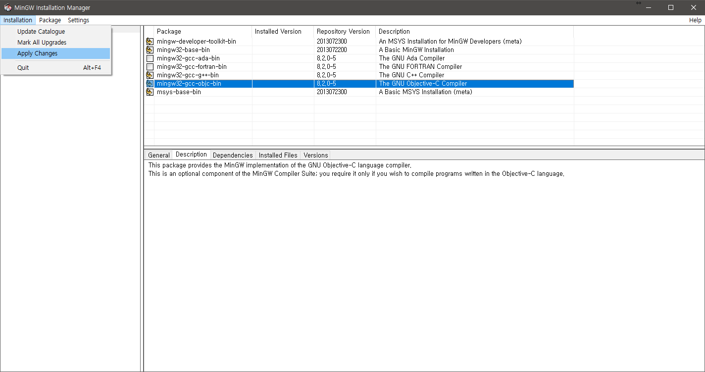 (자동 실행이 안될 경우, 프로그램의 'MinGW Installation Manager'를 실행해주시면 됩니다.)