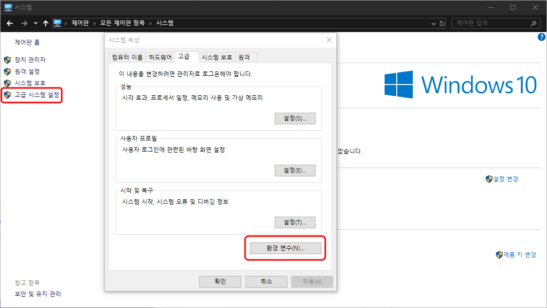 시스템 창에서 '고급 시스템 설정'을 선택하여 나오는 '시스템 속성' 창에서 환경변수를 선택해 줍니다.