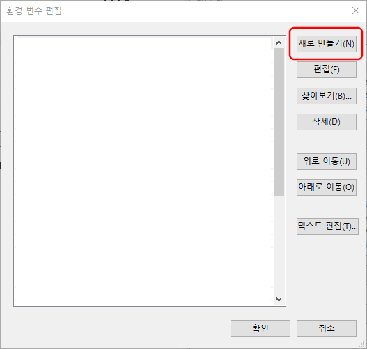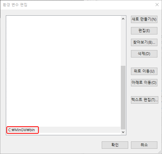 환경 변수 편집 창에서 '새로 만들기(N)'를 선택하여 MinGW가 설치된 'MinGW\bin'경로를 지정해줍니다.