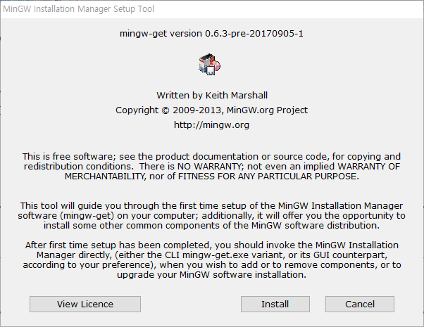 'MinGW Installation Manager Setup Tool' 창이 나오면 'Install' 버튼을 눌러서 설치를 진행합니다.