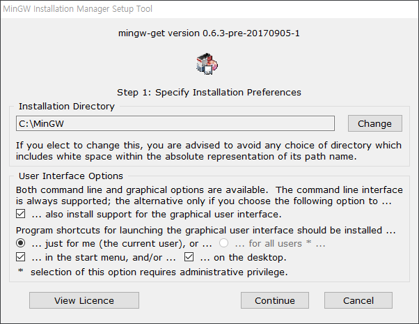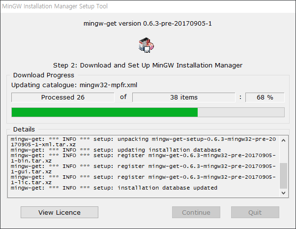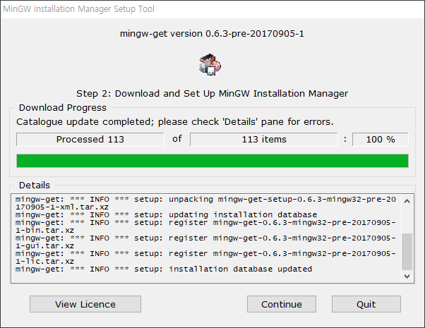'Continue' 버튼을 누르면 'MinGW Installation Manager'가 실행이 됩니다.