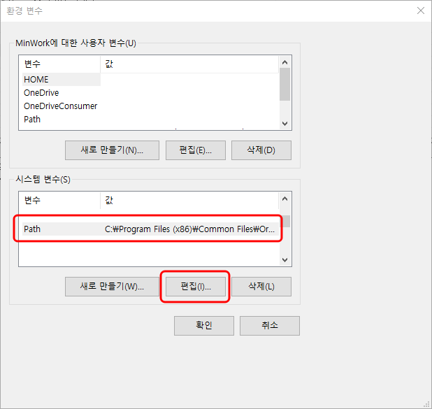 환경 변수 창에서 시스템 변수를 선택하고 'path'를 더블클릭을 하거나 선택 후 편집을 눌러서 환경 변수 편집 창을 엽니다.