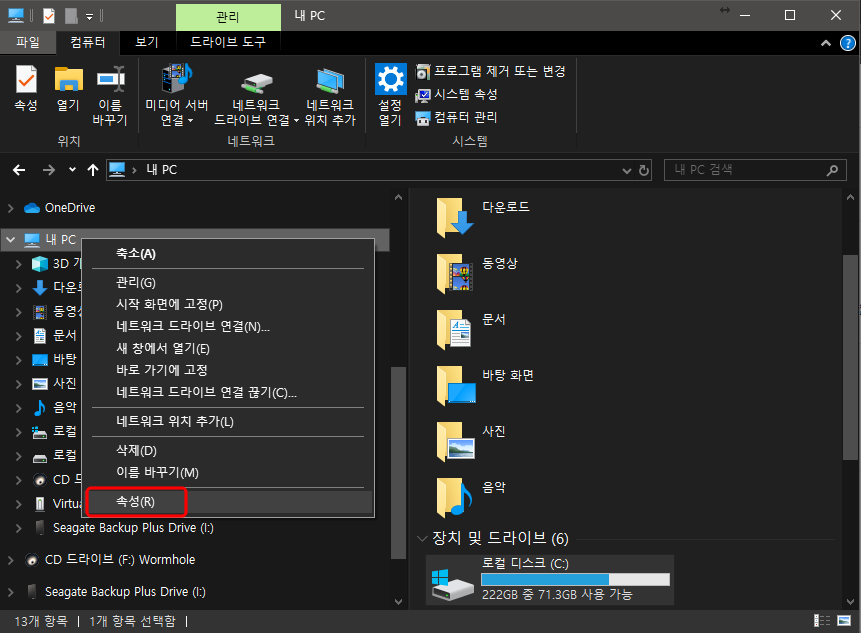 파일 탐색기에서 '내 PC'에서 마우스 오른쪽을 눌러서 '속성'으로 들어가셔도 됩니다.