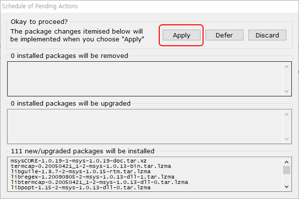 'Schedule of Pending Actions' 창에서 'Apply'를 선택한 패키지가 설치됩니다.