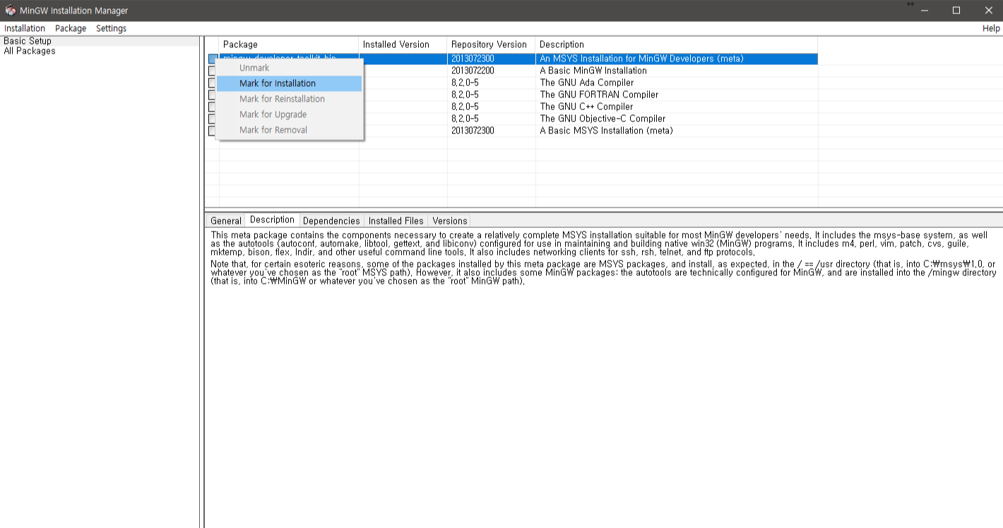 (miggw-developer-toolkit-bin을 체크하면 msys-base-bin이 자동으로 체크됩니다.)