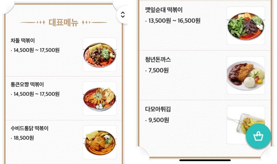 청년다방의 대표 메뉴로는 차돌 떡볶이, 통큰오짱 떡볶이, 수비드통닭 떡볶이,
