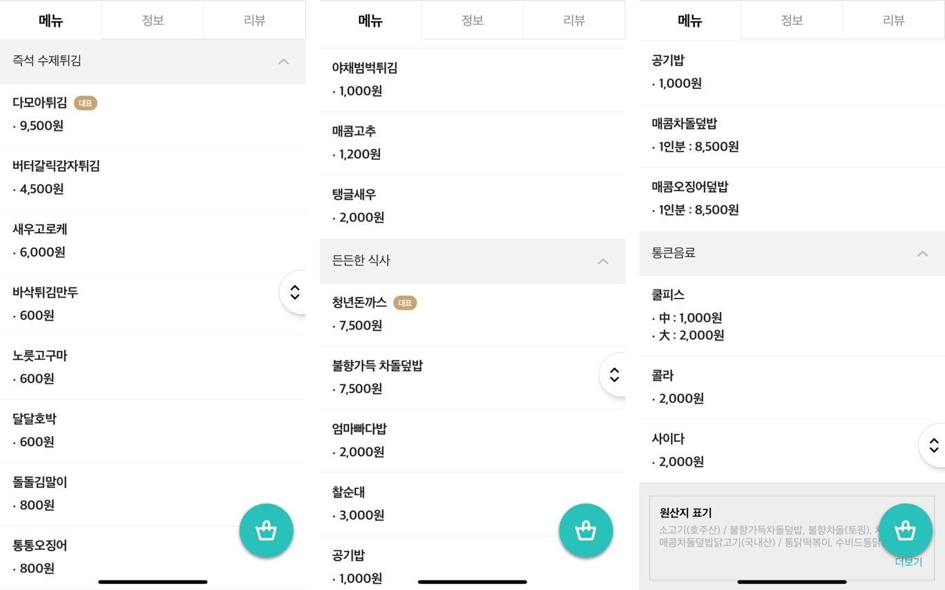 깻잎순대 떡볶이, 청년돈까스, 다모아튀김이 있었어요.