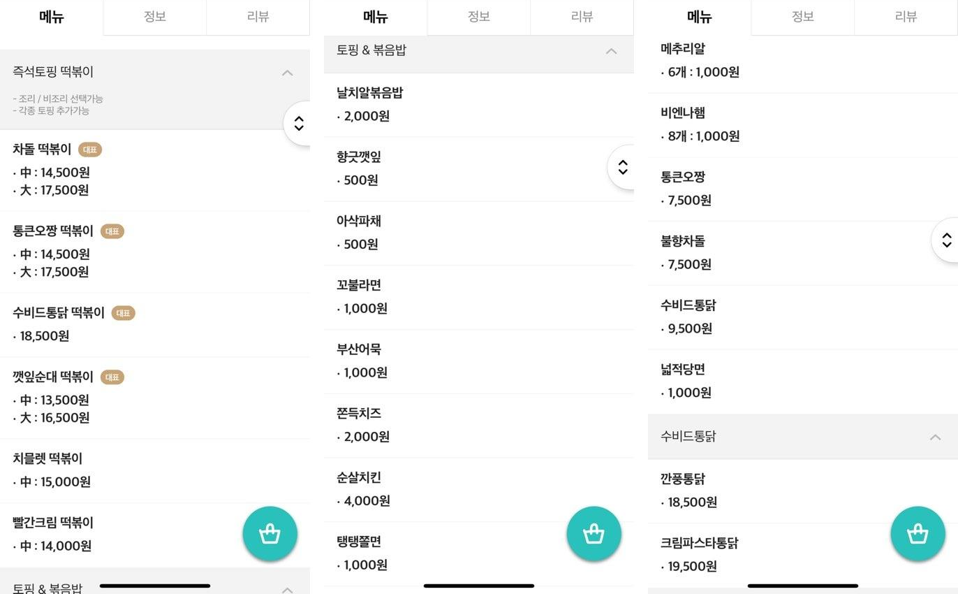 기본이 중이었고, 차돌 떡볶이와 통큰오짱 떡볶이, 깻잎순대 떡볶이만 '대' 사이즈가 있었어요.