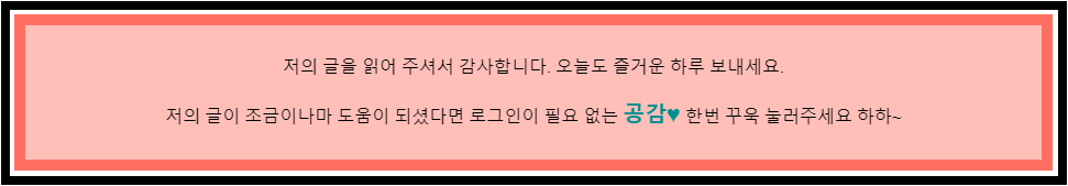 저의 글이 조금이나마 도움이 되셨다면 로그인이 필요 없는 공감♥ 한번 꾸욱 눌러주세요 하하~