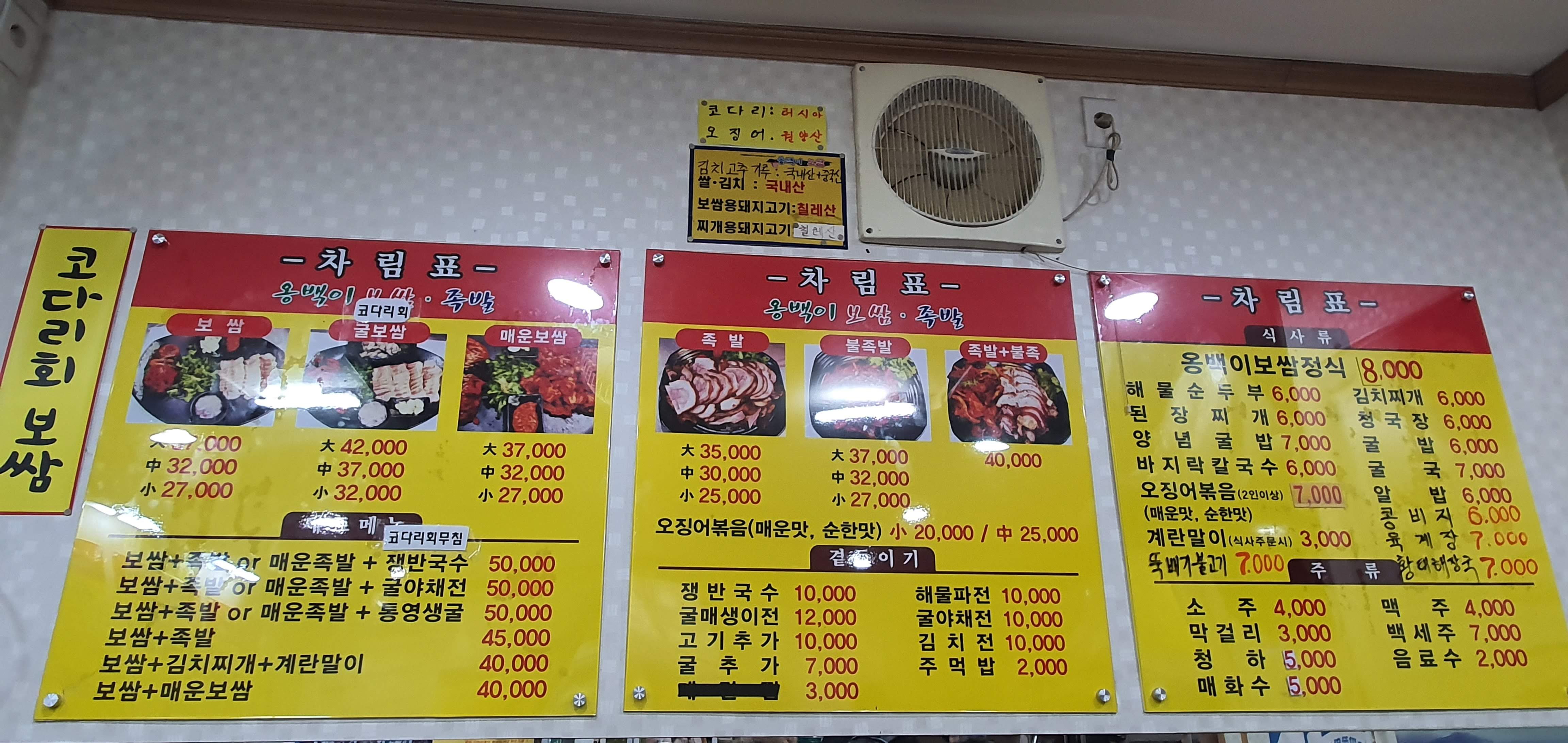 옹백이 보쌈 메뉴
