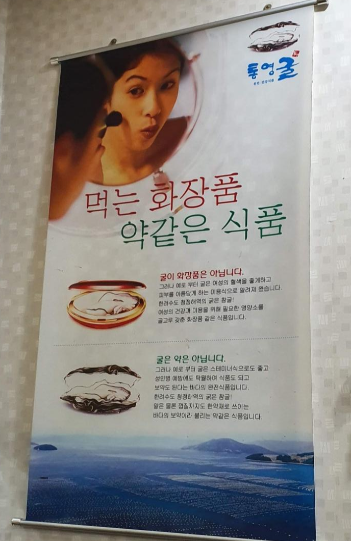 통영 굴에 대한 정보도 벽에 붙어 있었어요. ㅎㅎ