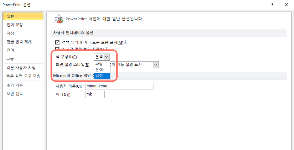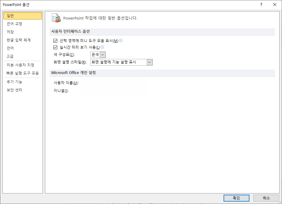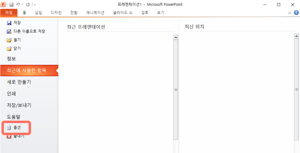 파워포인트(PowerPoint) 옵션 설정 진입 : 파일 > 옵션