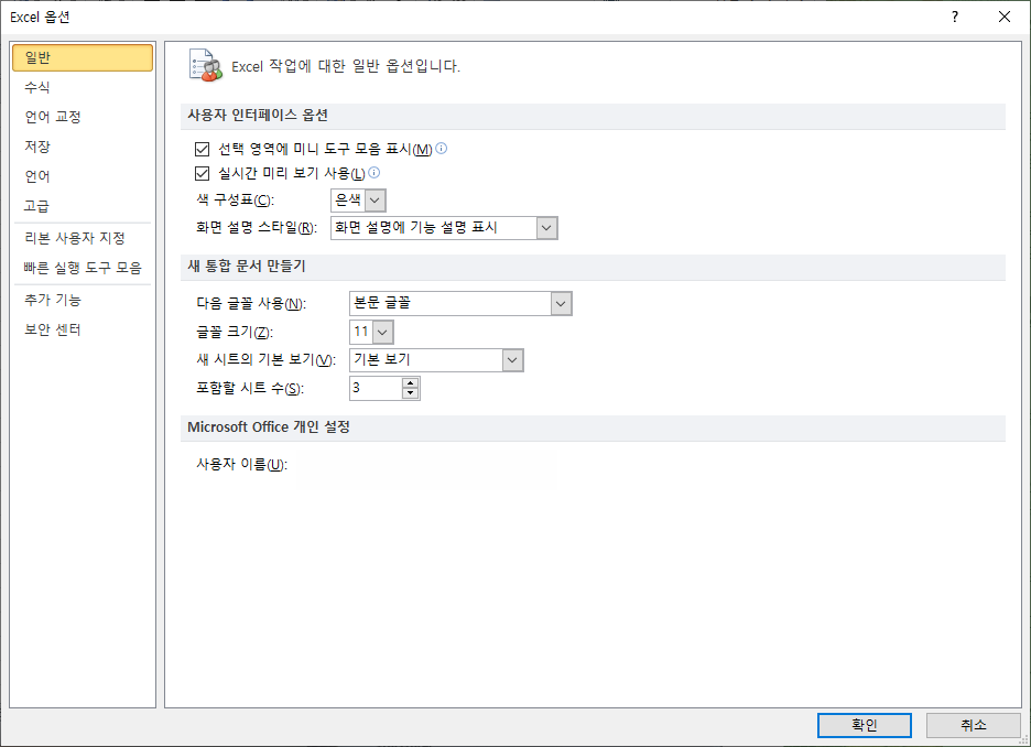 마이크로소프트 오피스에서 옵션 진입 방법은 세 가지 전부 동일하게 진입을 합니다.