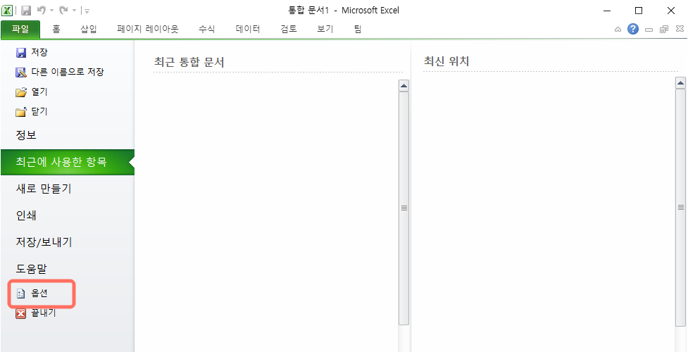 엑셀(Excel) 옵션 설정 진입 : 파일 > 옵션