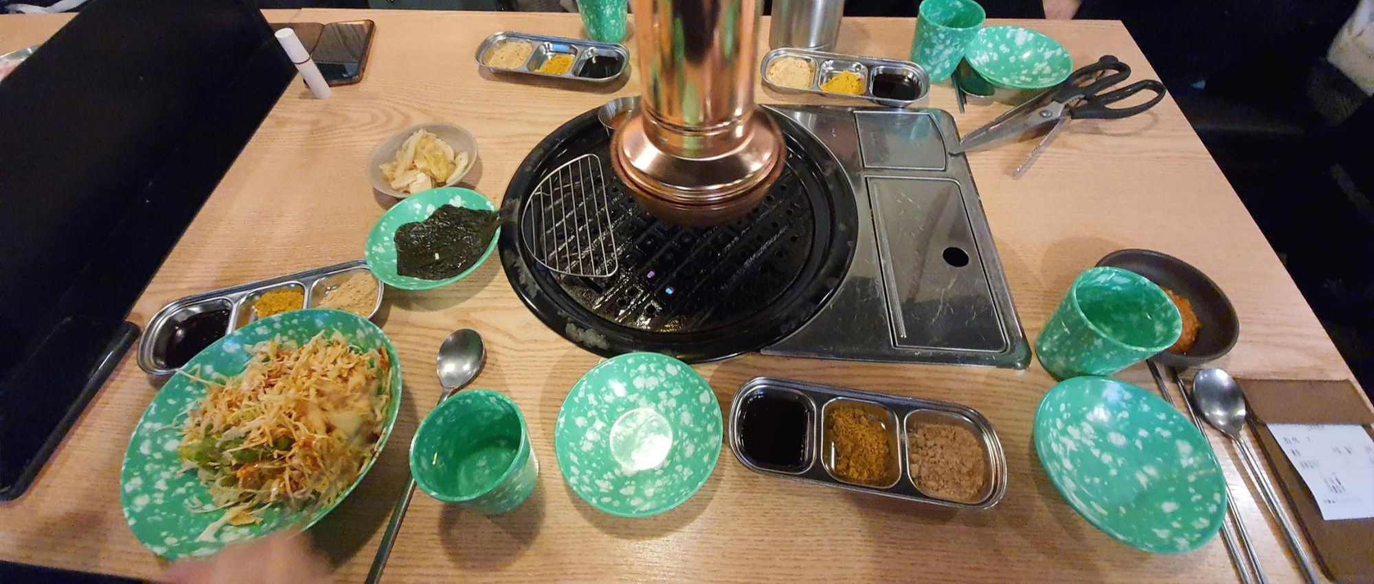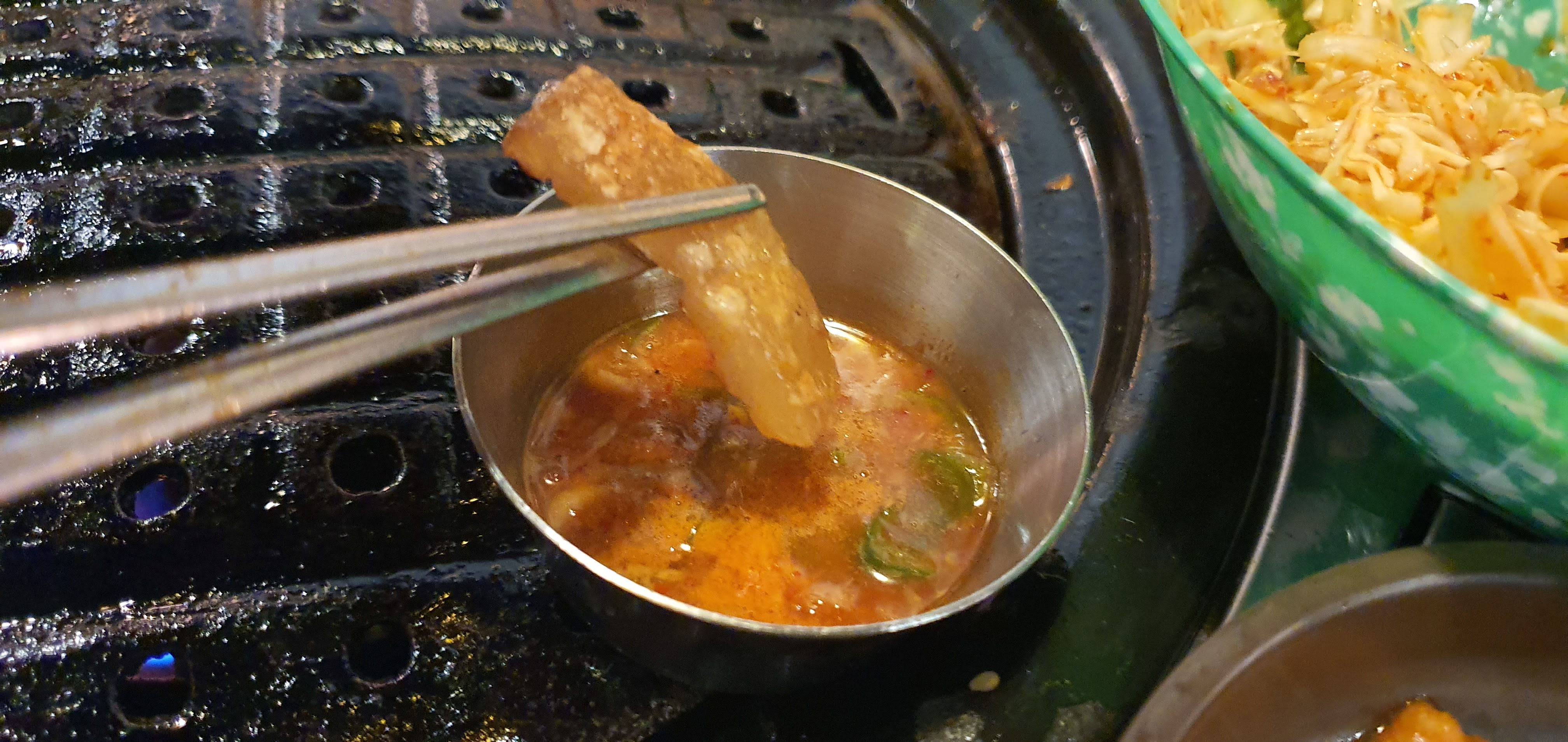 깻잎과 매운 소스장, 카레 가루, 콩고물 가루, 그리고 양배추 버무림이 세팅이 되었어요.