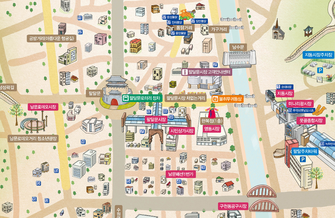 팔달문 시장, 영동 시장, 지동시장, 미나리광시장, 못골 종합시장, 남문로데오시장, 시민상가시장, 구천동 공구시장들이 있어요.