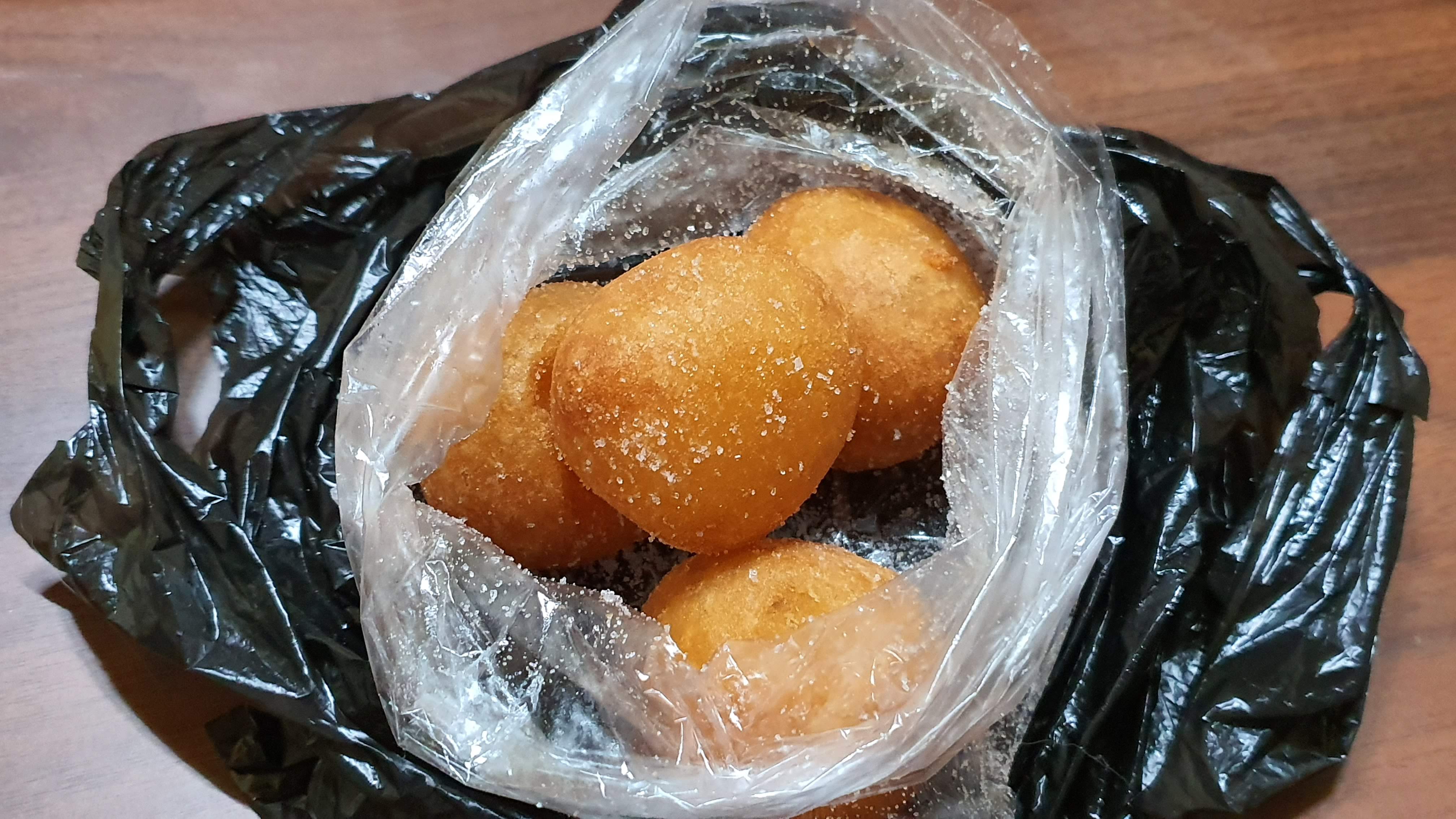수원 남문 '김도넛'에서 1,000원에 4개인 찹쌀도너츠에 설탕을 뿌려 달라고 해서 사 왔어요.