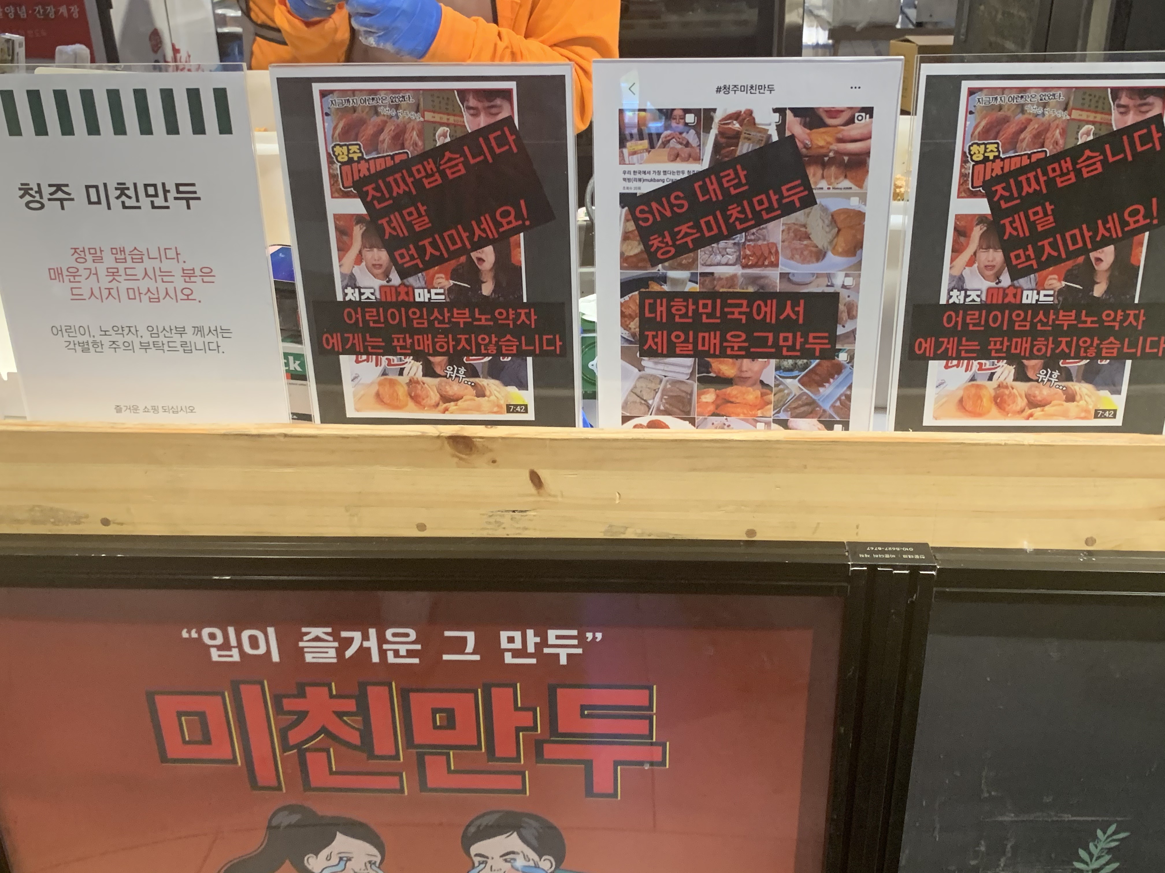 매장 앞에는 미친 만두에 대한 주의 문구가 있었어요.