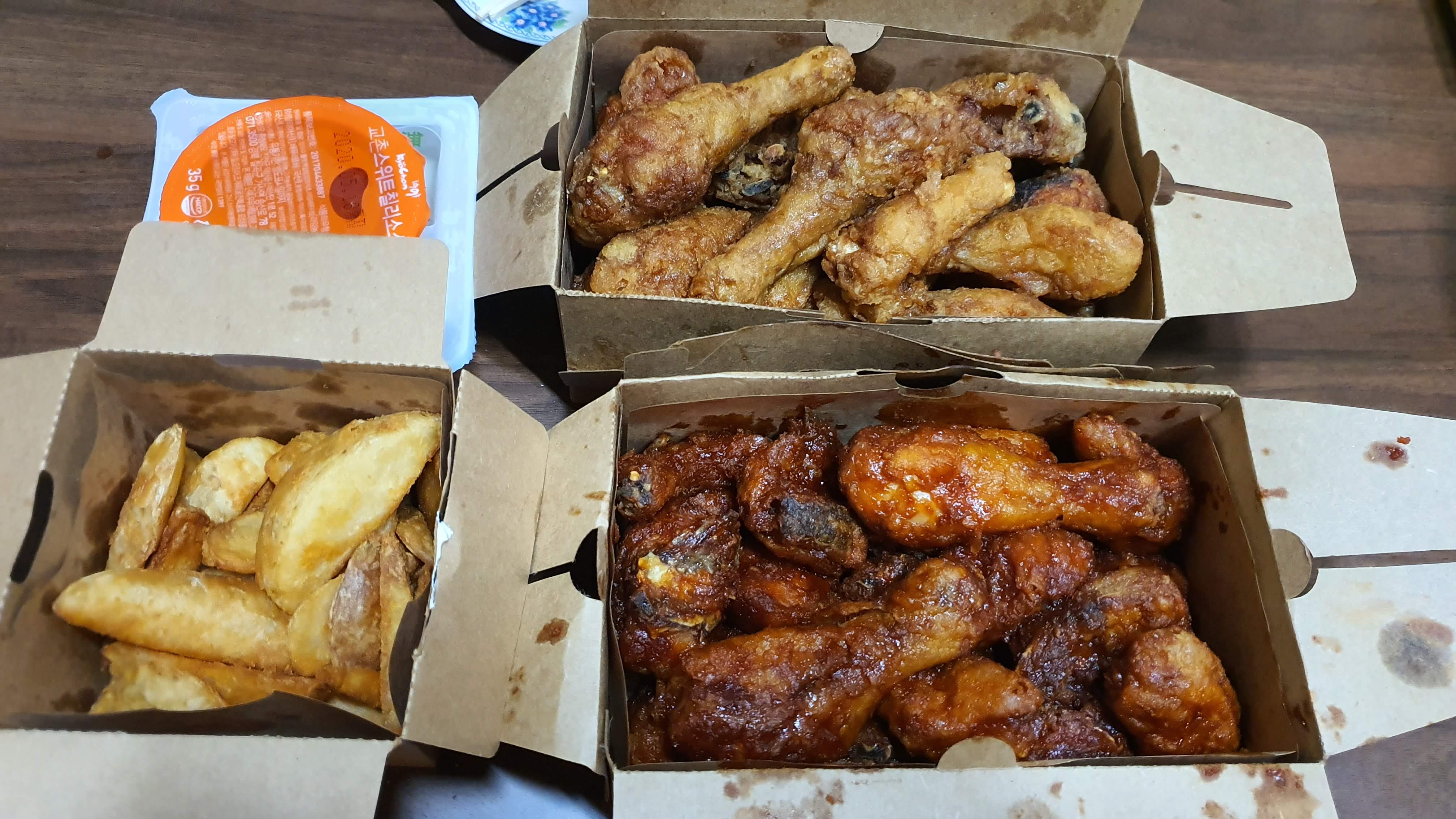 교촌오리지날은 교촌의 대표 메뉴답게 간장소스 하면 교촌치킨이라고 할 수 있을 정도로 교촌만의 맛을 느낄 수 있고 맛있었어요. 교촌레드오리지날은 처음 먹었을 때는 맵다고 느꼈는데요. 요즘 매운맛을 자주 접해 먹다 보니 맵다는 생각은 안 들었어요. 개인적으로 캡사이신의 매운맛보다는 고추의 매운맛을 좋아해서인지 레드오리지널은 계속 손이갔어요. ㅎㅎ 웨지감자는 통감자를 잘라서 튀겨냈는데요. 감자의 담백한 맛이 좋아요. 자칫 느끼할 수도 있는데 칠리소스에 찍어먹으면 괜찮더라고요. ㅎㅎ