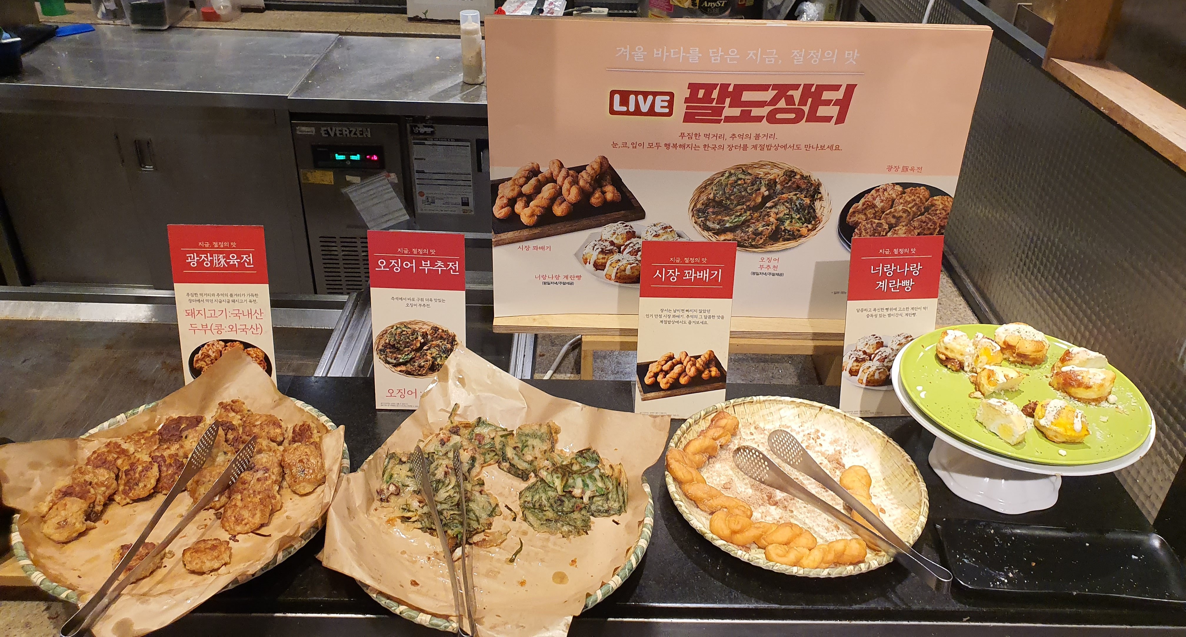 팔도장터에는 광장 육전, 오징어 부추전, 시장 꽈배기, 너랑나랑 계란빵이 있어요.