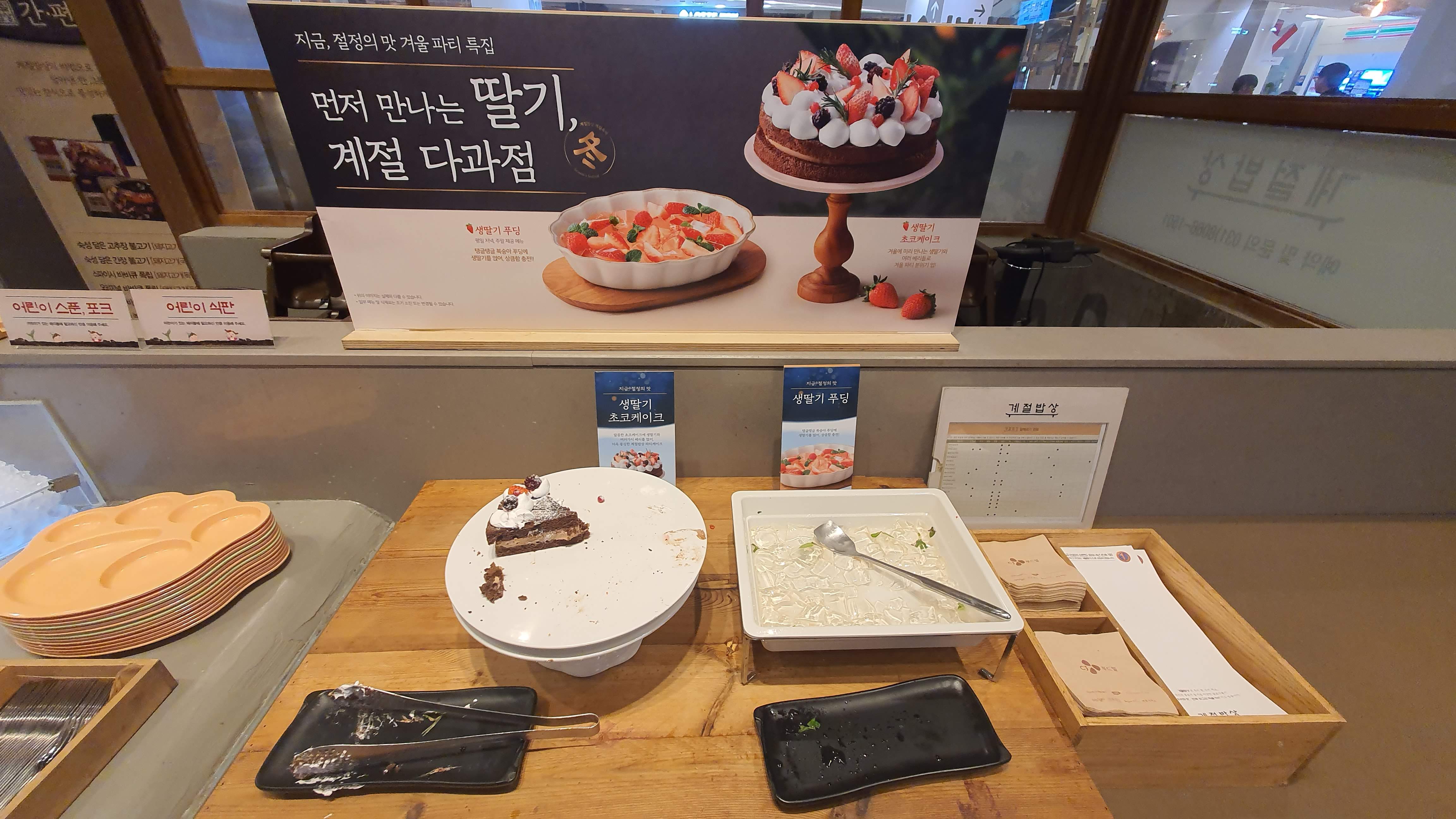 한때 계절밥상을 자주 갔었는데요. 오랜만에 가서 식성이 변한 것인지 생각보다는 작은 한식 뷔페로 규모와 음식 종류가 적은 듯한 느낌을 받았어요. 이번 겨울 파티 특집으로 등갈비와 딸기였는데요. 등갈비는 먹을 만큼 먹기 좋았어요. 그렇지만 딸기는 케이크와 푸딩만 있었다는 것과 바로 채워지지 놓지 않은 부분이 아쉬웠어요.