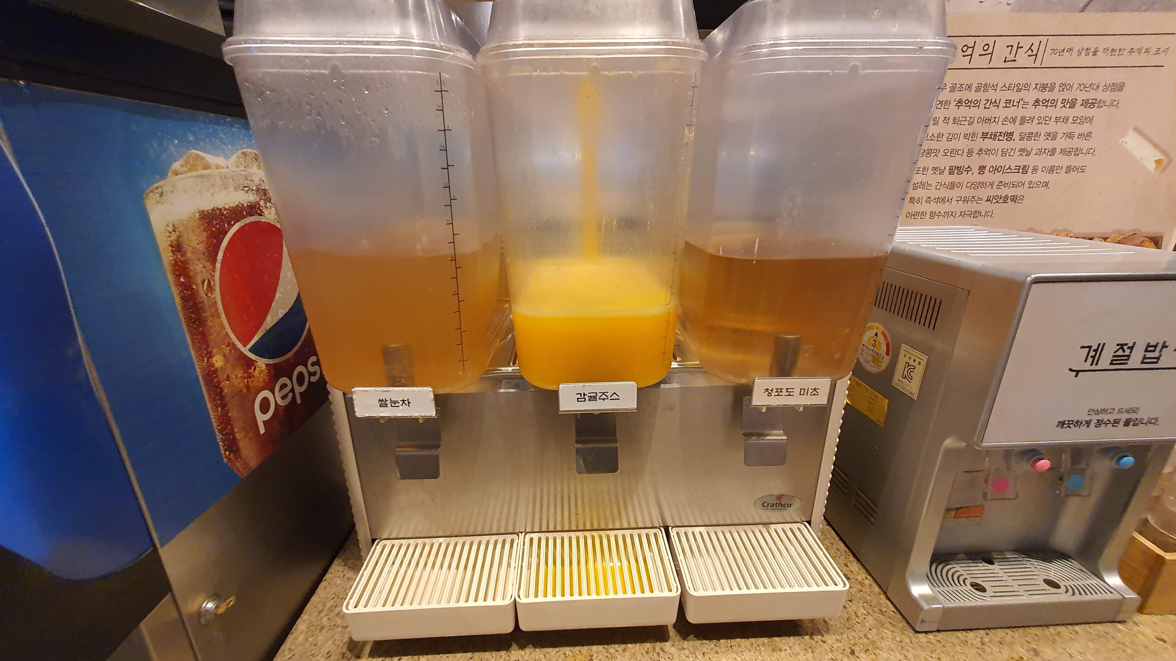 계절밥상에는 음료수 외에 별도로 쌀눈차, 감귤주스, 청포도 미초가 준비되어 있어요.