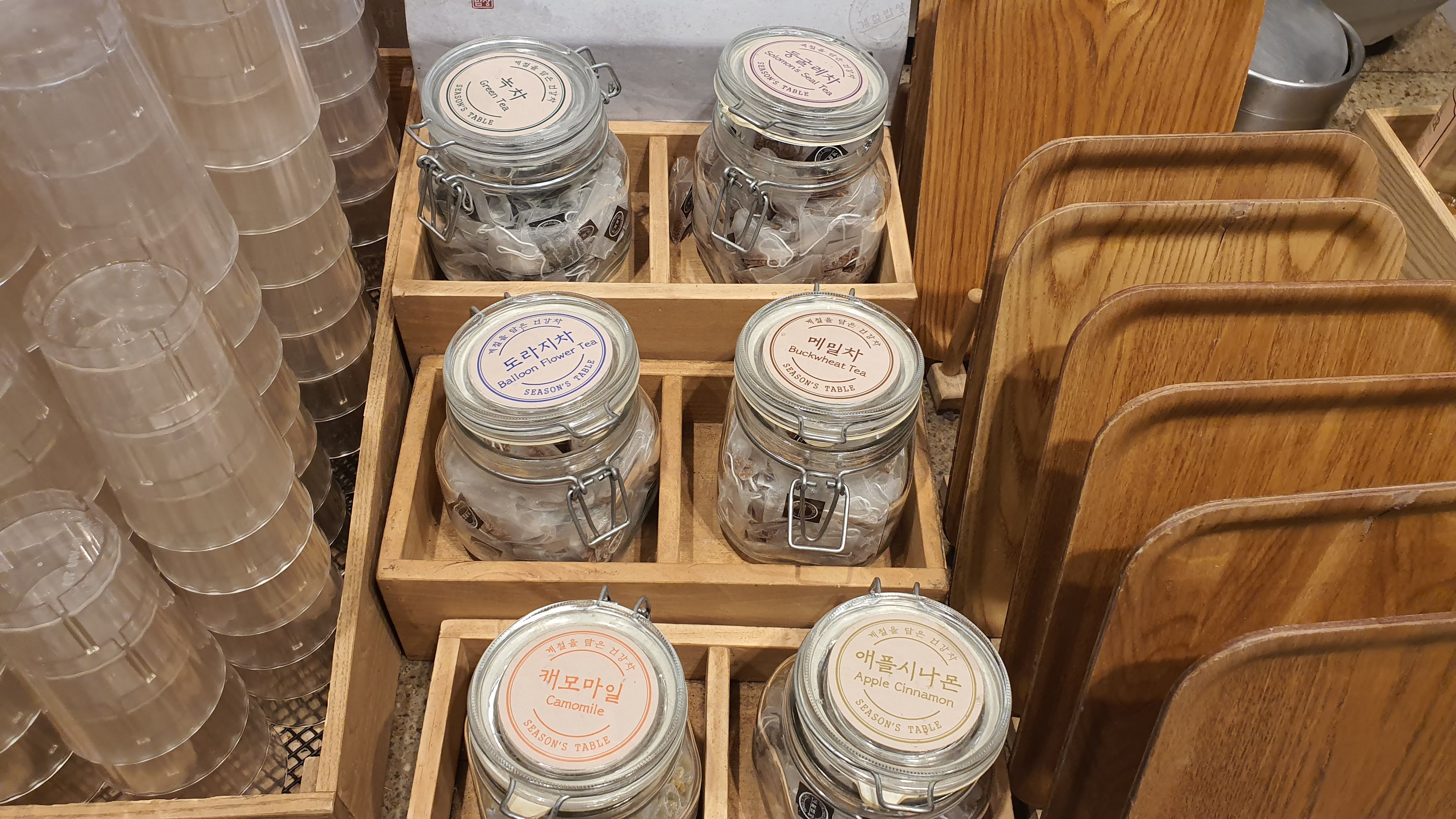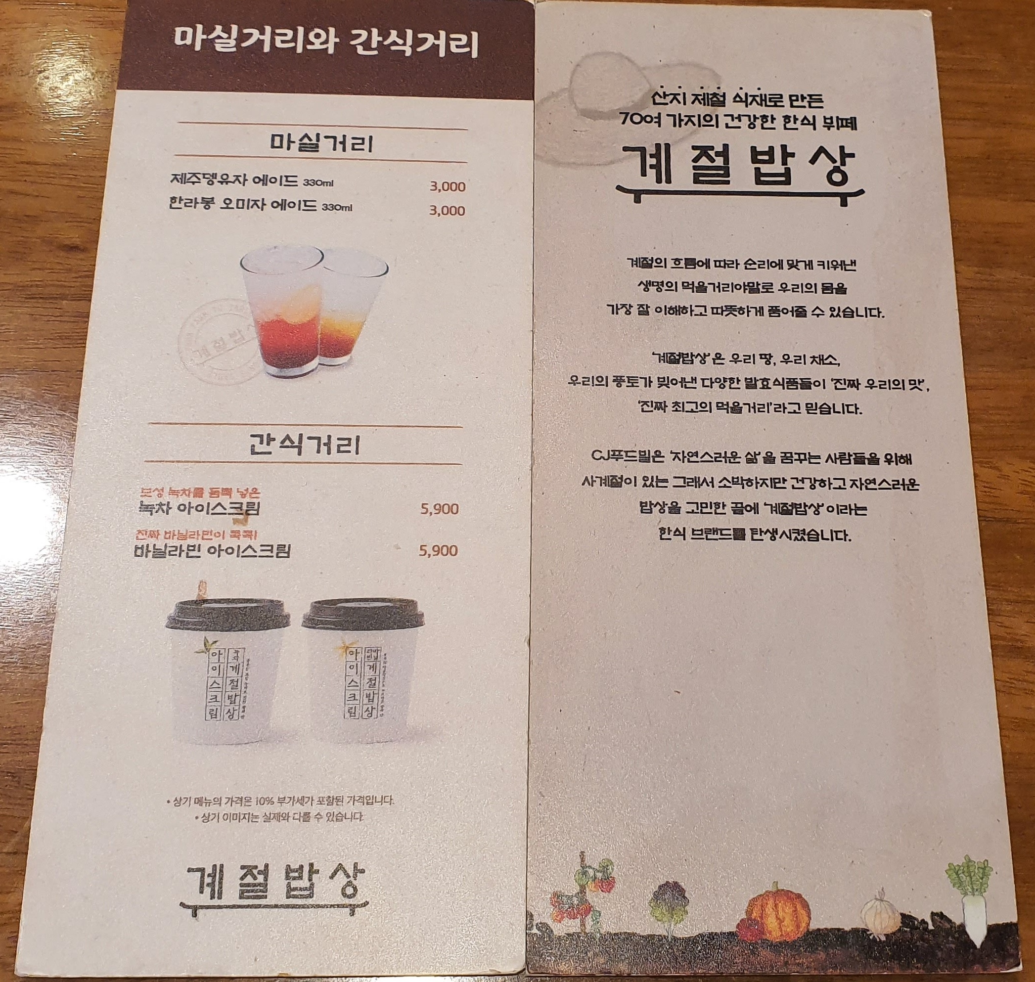 계절밥상에는 음료수 외에 별도로 쌀눈차, 감귤주스, 청포도 미초가 준비되어 있어요.