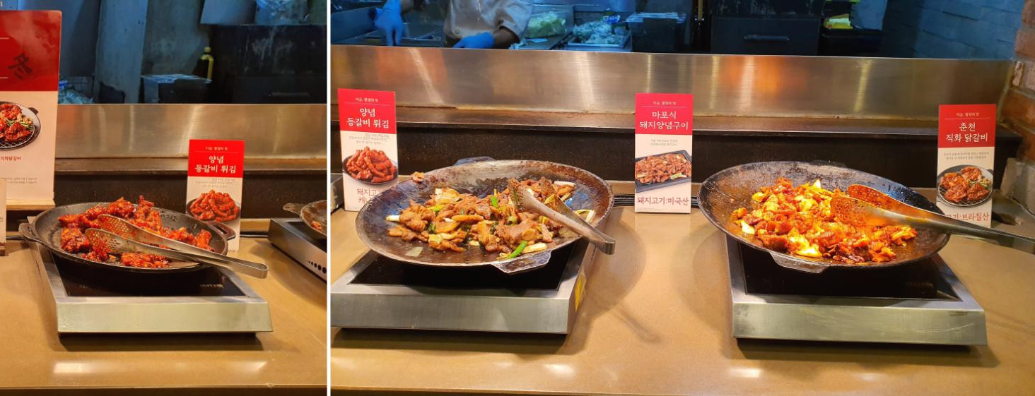 양념 등갈비 튀김과 마포식 돼지 양념구이, 춘천 직화 닭갈비가 있었어요.