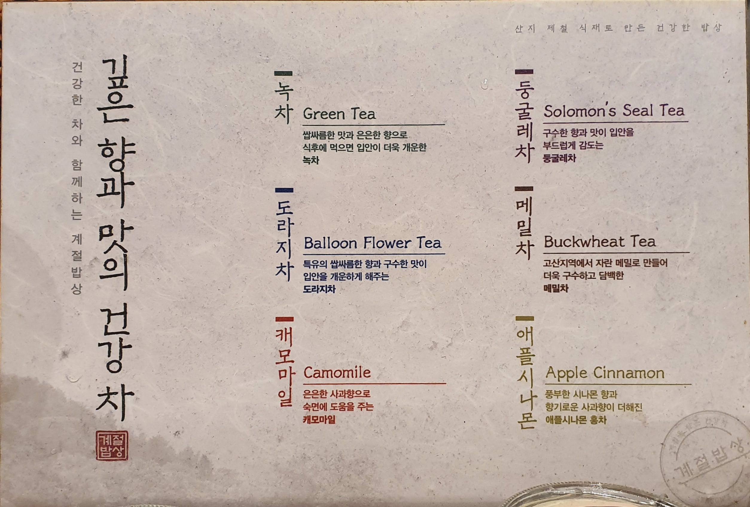 그리고 차를 마실수 있게 6가지의 차 티백이 준비되어 있어요.