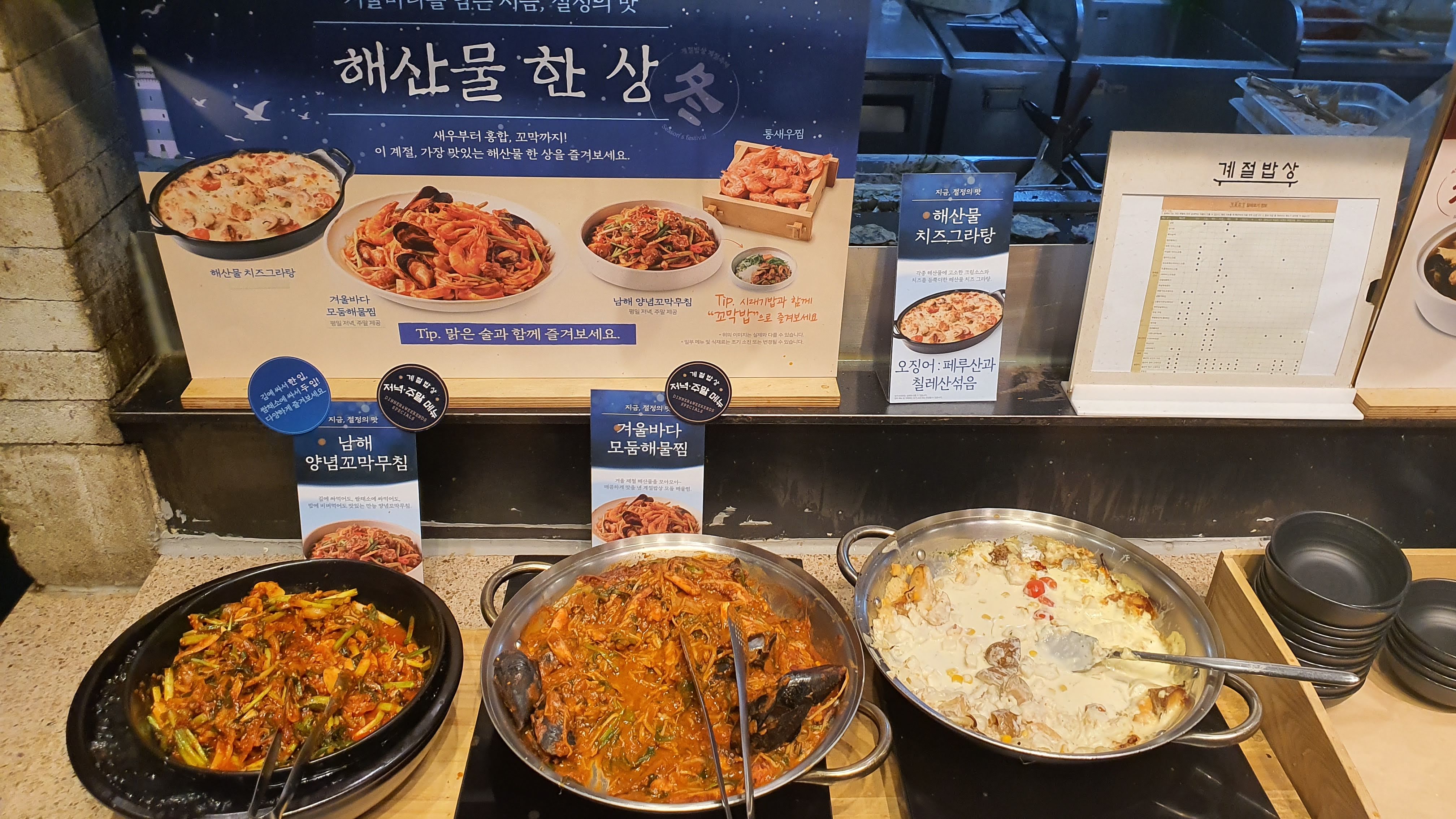 해산물 한상에는 남해 양념 꼬막무침, 겨울바다 모둠 해물찜, 해산물 치즈 그라탕,