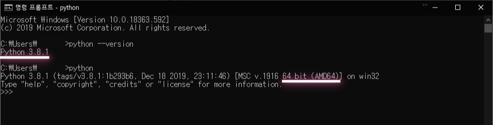 그리고 명령줄에 'python' 명령으로 python을 실행해 보면 64bit가 설치된 것을 알 수 있습니다.