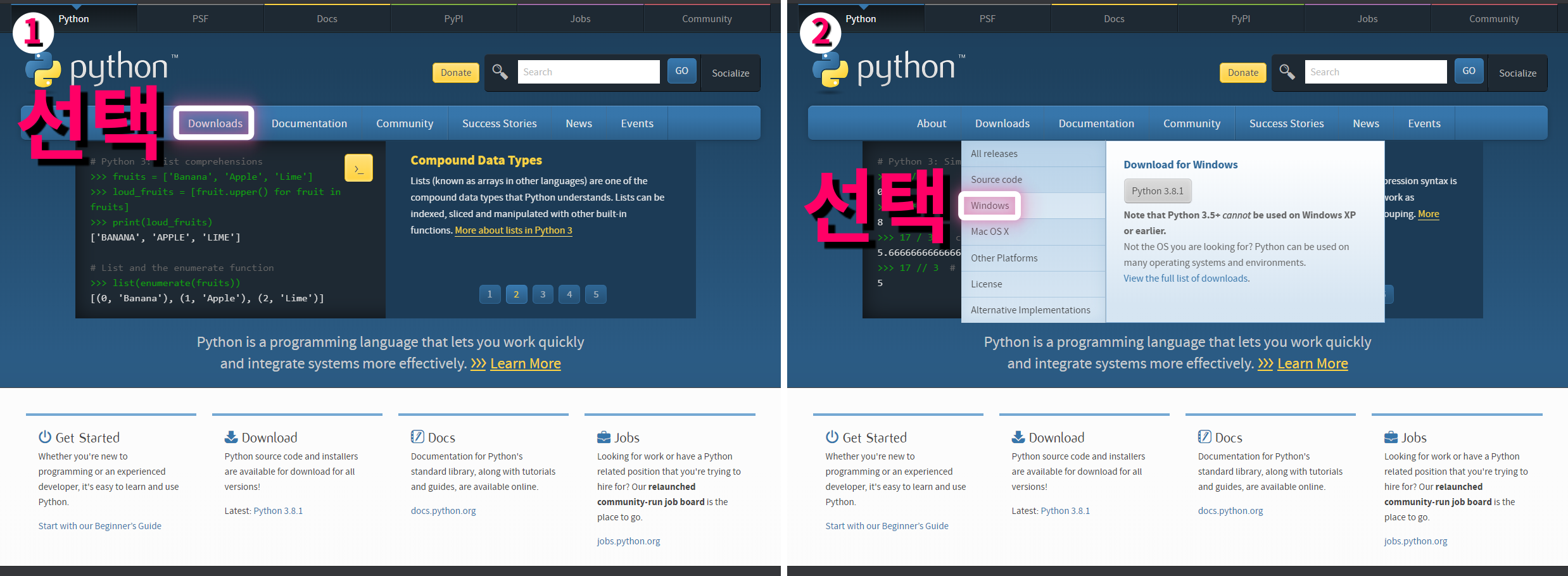 Python 사이트에 접속하여, Downloads 메뉴를 선택(①)하여 자신이 설치하고자 하는 OS를 선택(②) 합니다.