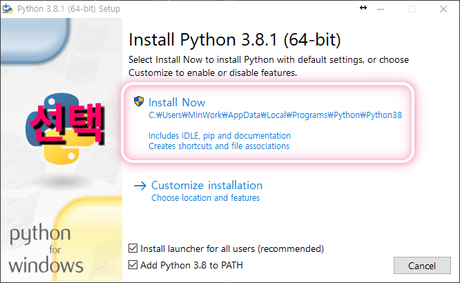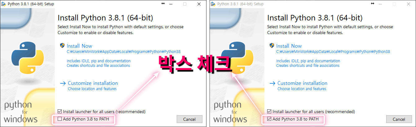 설치를 하면서 PATH를 등록이 되게 하기 위하여 설치 화면에서 'Add Python 3.8 to PATH'를 체크해줍니다.