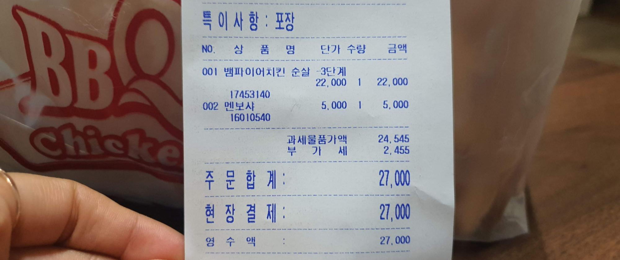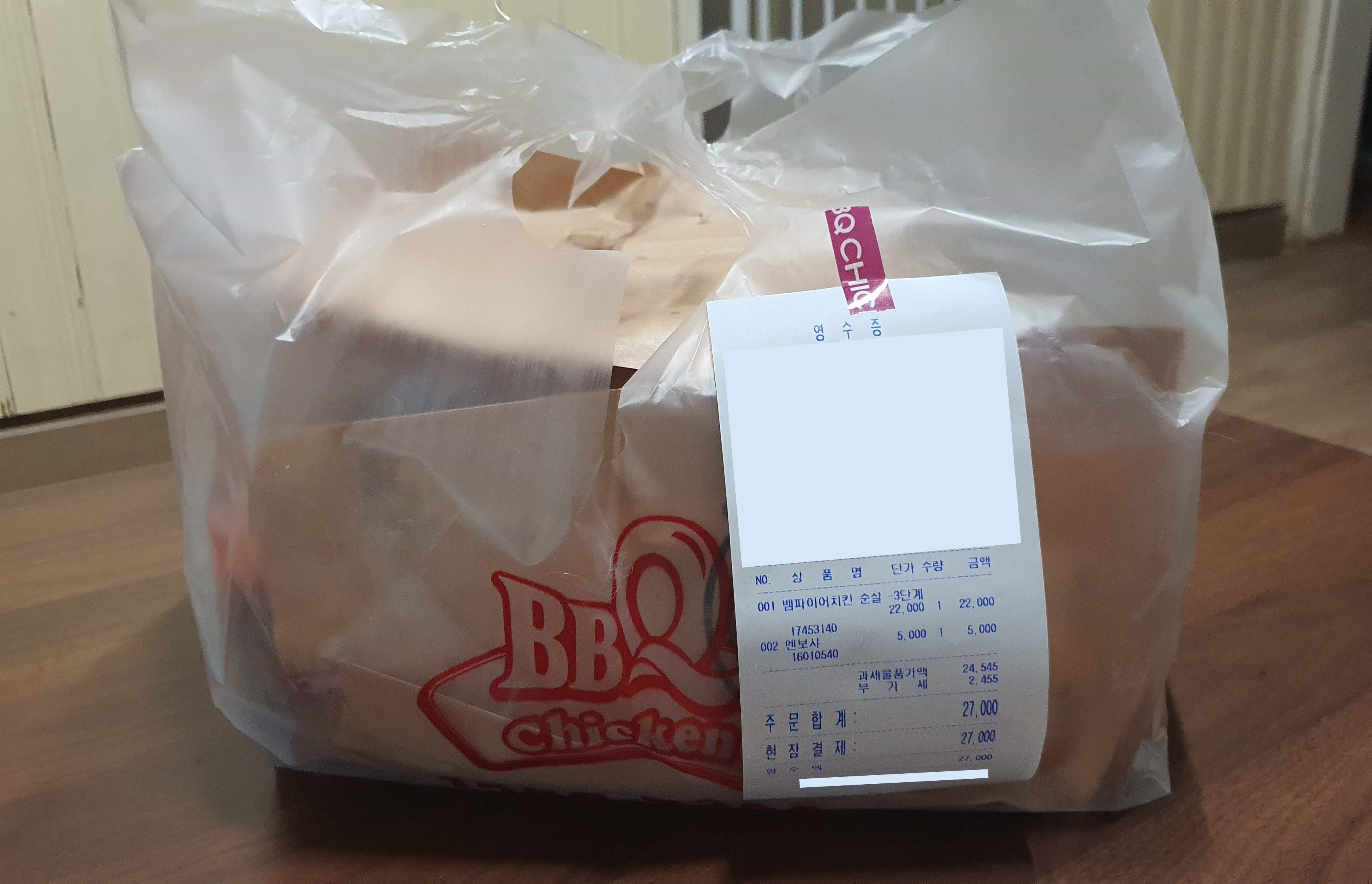 저희는 BBQ에서 뱀파이어 치킨 3단계 헬게이트 가격은 22,000원이고 저희는 추가로 멘보샤(5,000원)를 시켰어요.