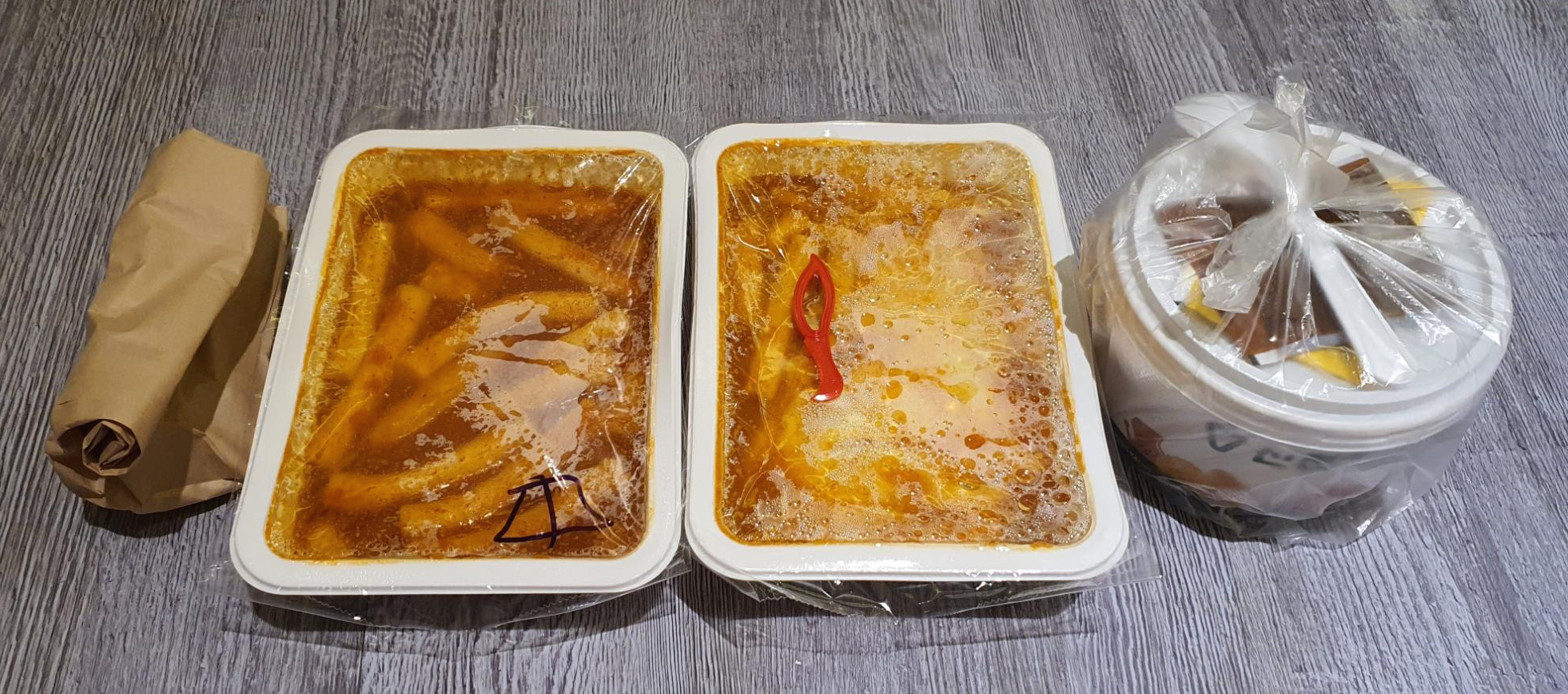 저희는 중간맛 떡볶이, 매운맛 치즈떡볶이, 오뎅튀김, 참치마요컵밥을 주문해서 포장했어요^^