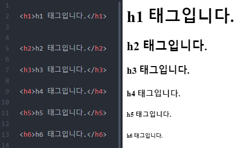 'h 태그'는 'h1, h2, h3, h4, h5, h6'까지 총 6가지의 단계로 사용할수 있습니다.
