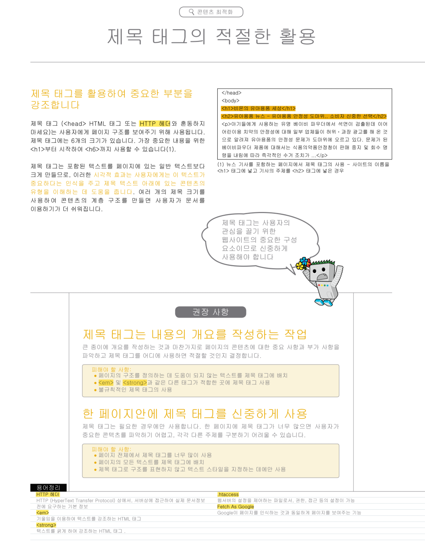 google에서 제공하는 'google 검색엔진 최적화 기본가이드'에서는 제목 태그('h 태그')에 대한 활용 가이드를 제공합니다.