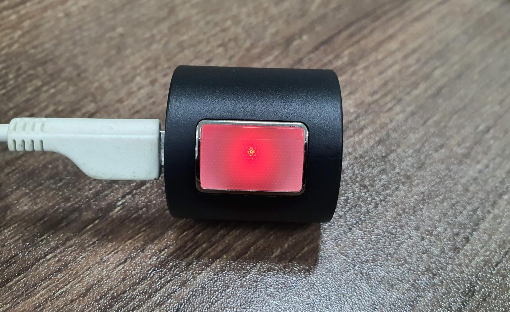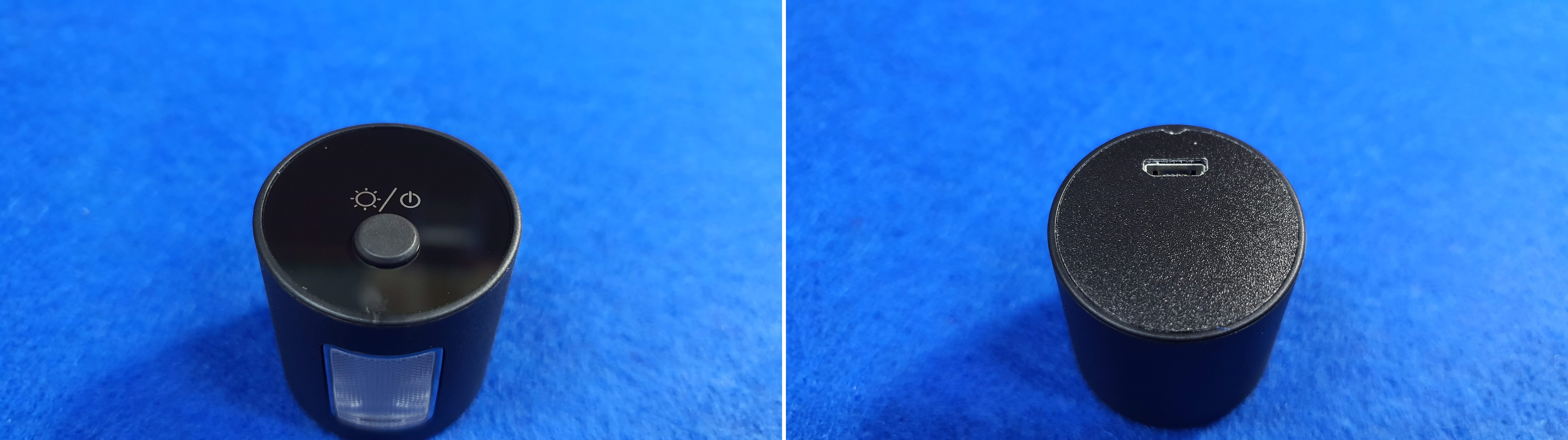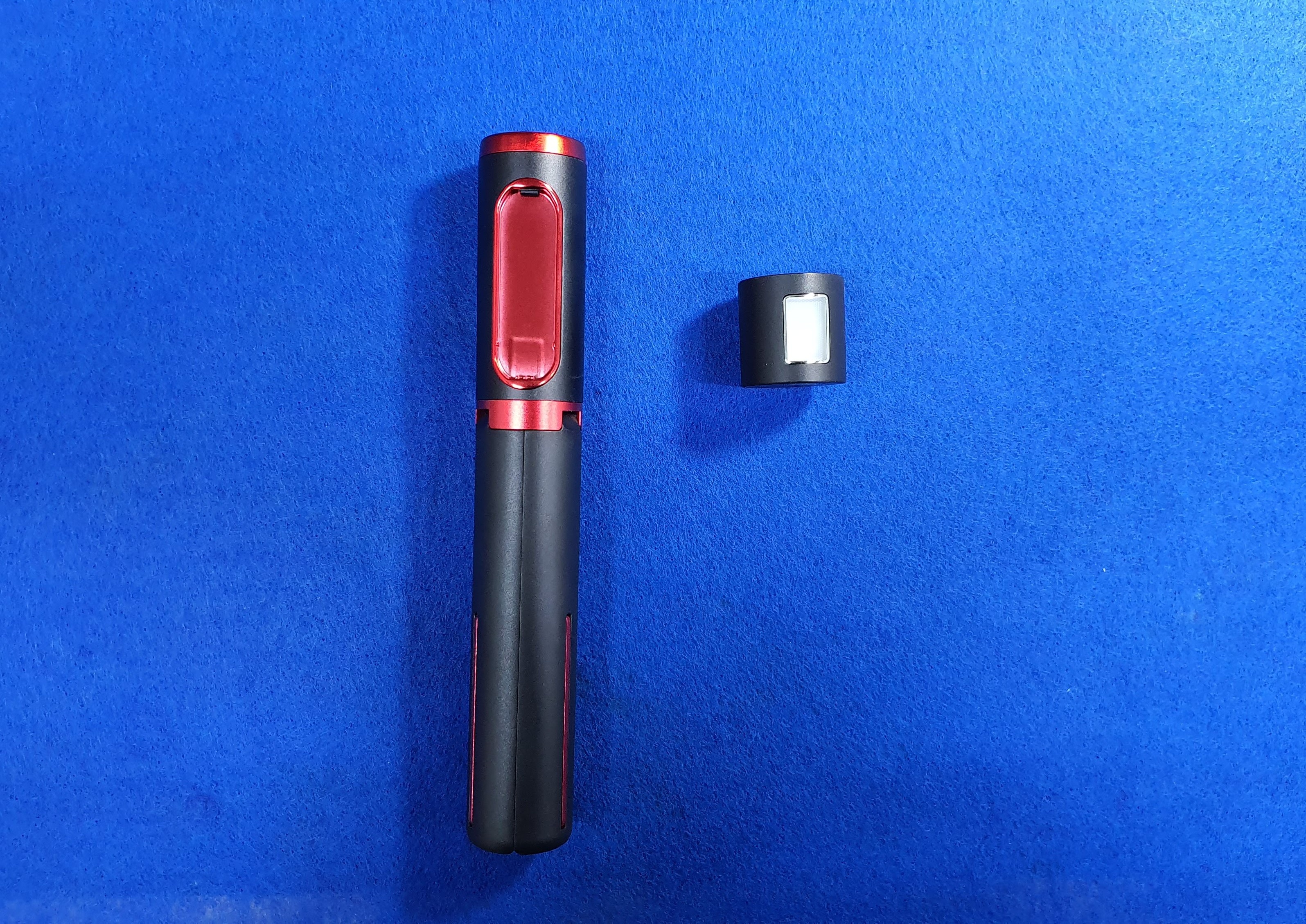 상단에 LED 조명을 켤 수 있는 버튼이 있고, 하단에 충전 단자가 있고 자석이 되어 있어서 셀카봉과 결속이 돼요.