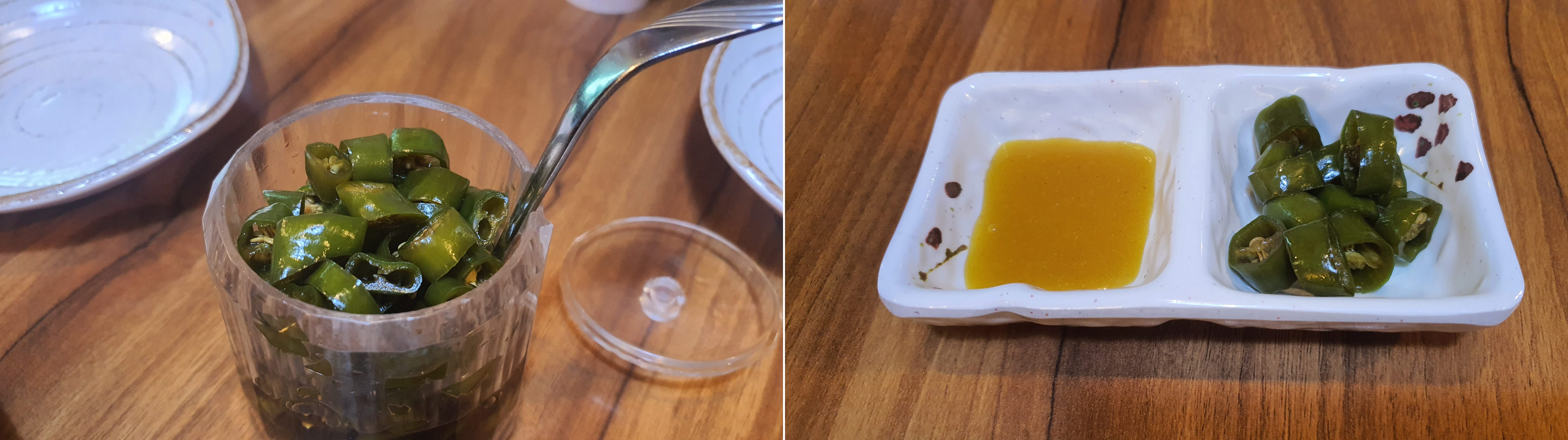 좌측에는 유자가 들어 있는 소스가 있고요. 우측에는 피클 같이 먹을 수 있는 무로 만든 것이 있었어요.
