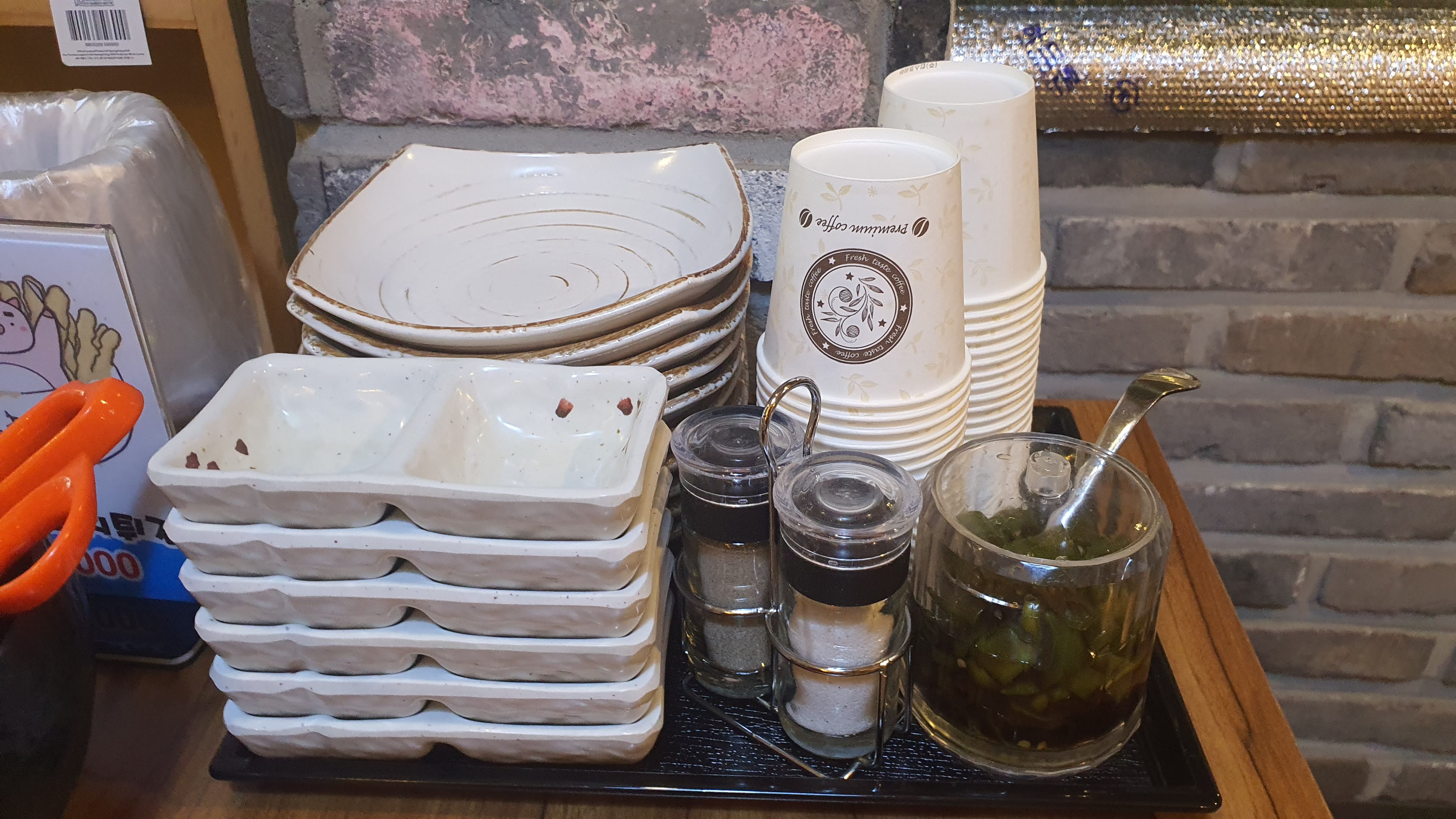 그리고 식탁 한쪽 편에는 앞 접시, 소스 그릇, 절인 고추와 소금, 머스터드소스가 있어요.