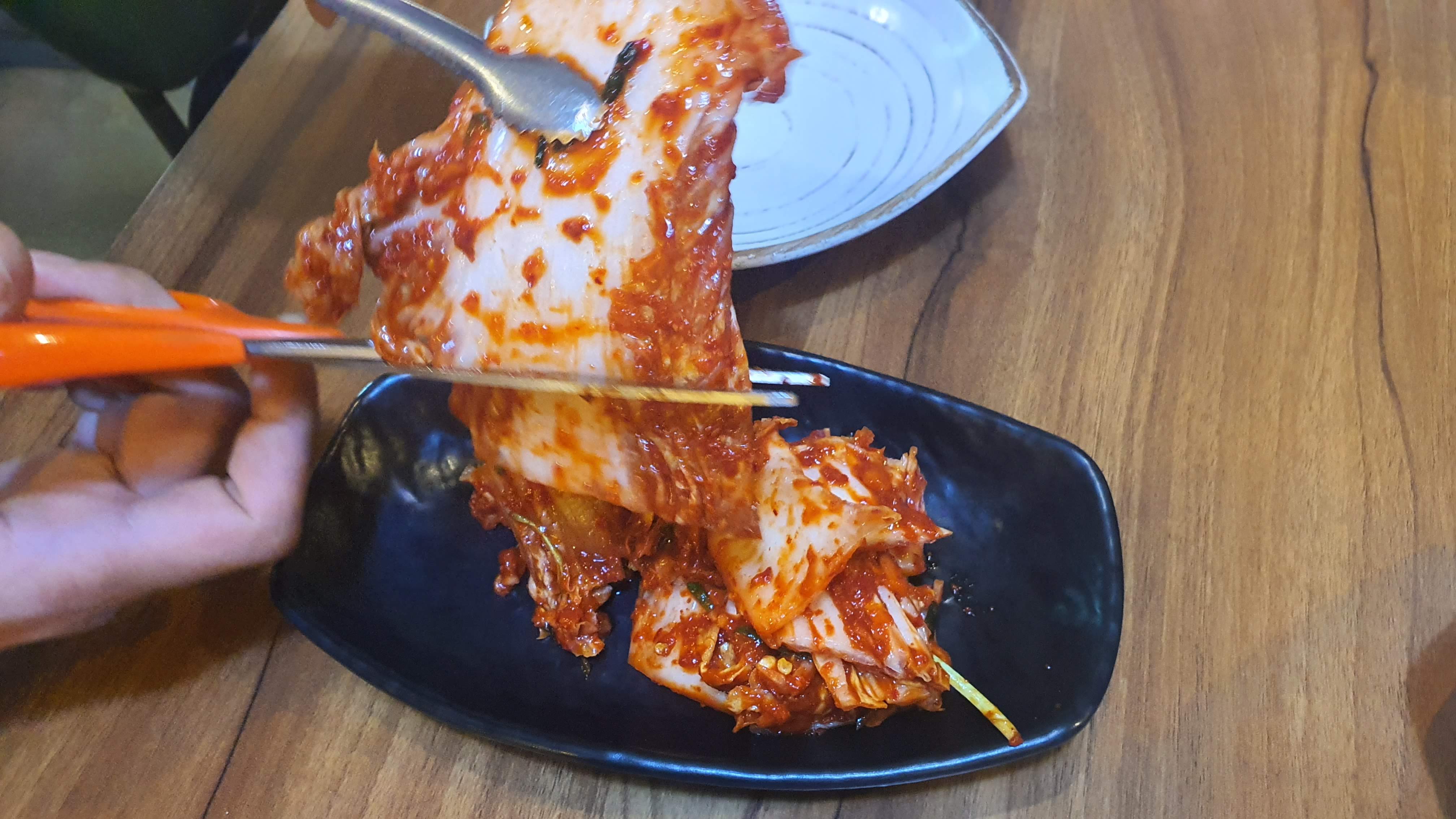 칼국수에서 빼놓을 수 없는 김치가 항아리에 나와요. 그럼 그릇에 옮겨서 먹기 좋게 잘라줘요.