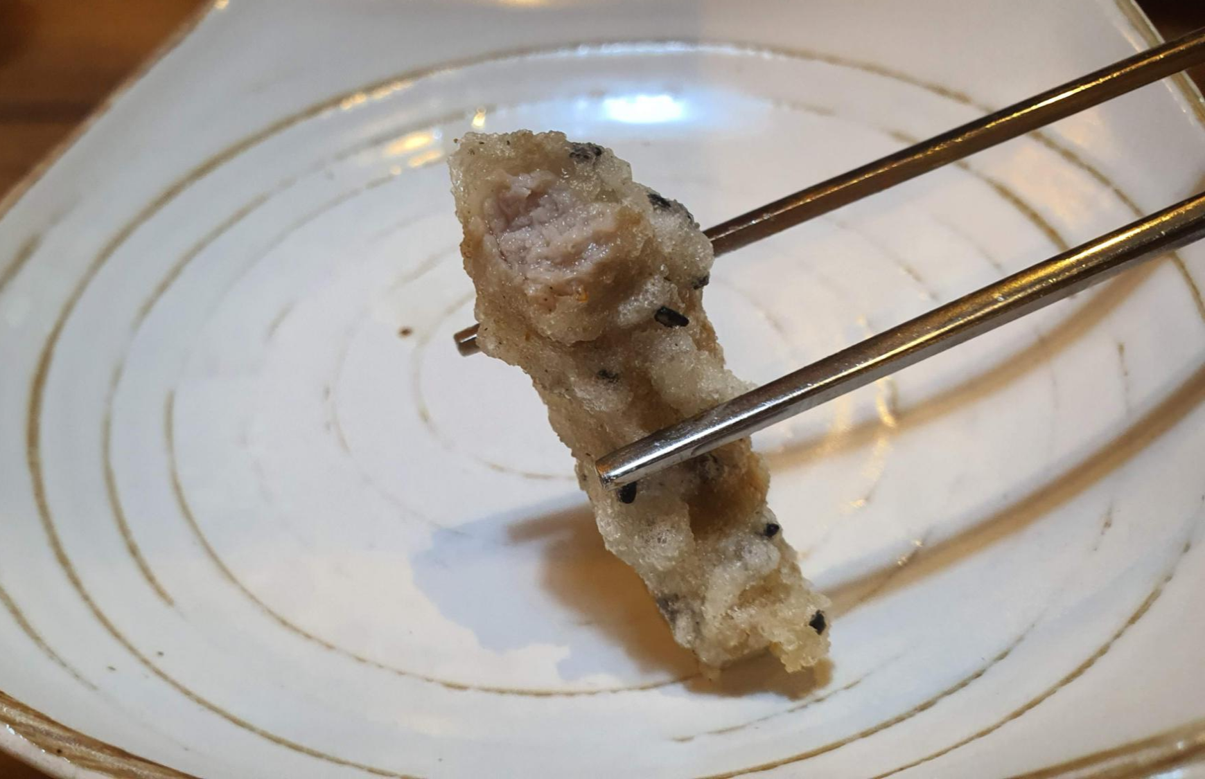 돼지고기에 얇은 튀김옷이 입혀져 있어서 속이 꽉 찬 고기 튀김을 먹는 기분이에요. ㅎㅎㅎ