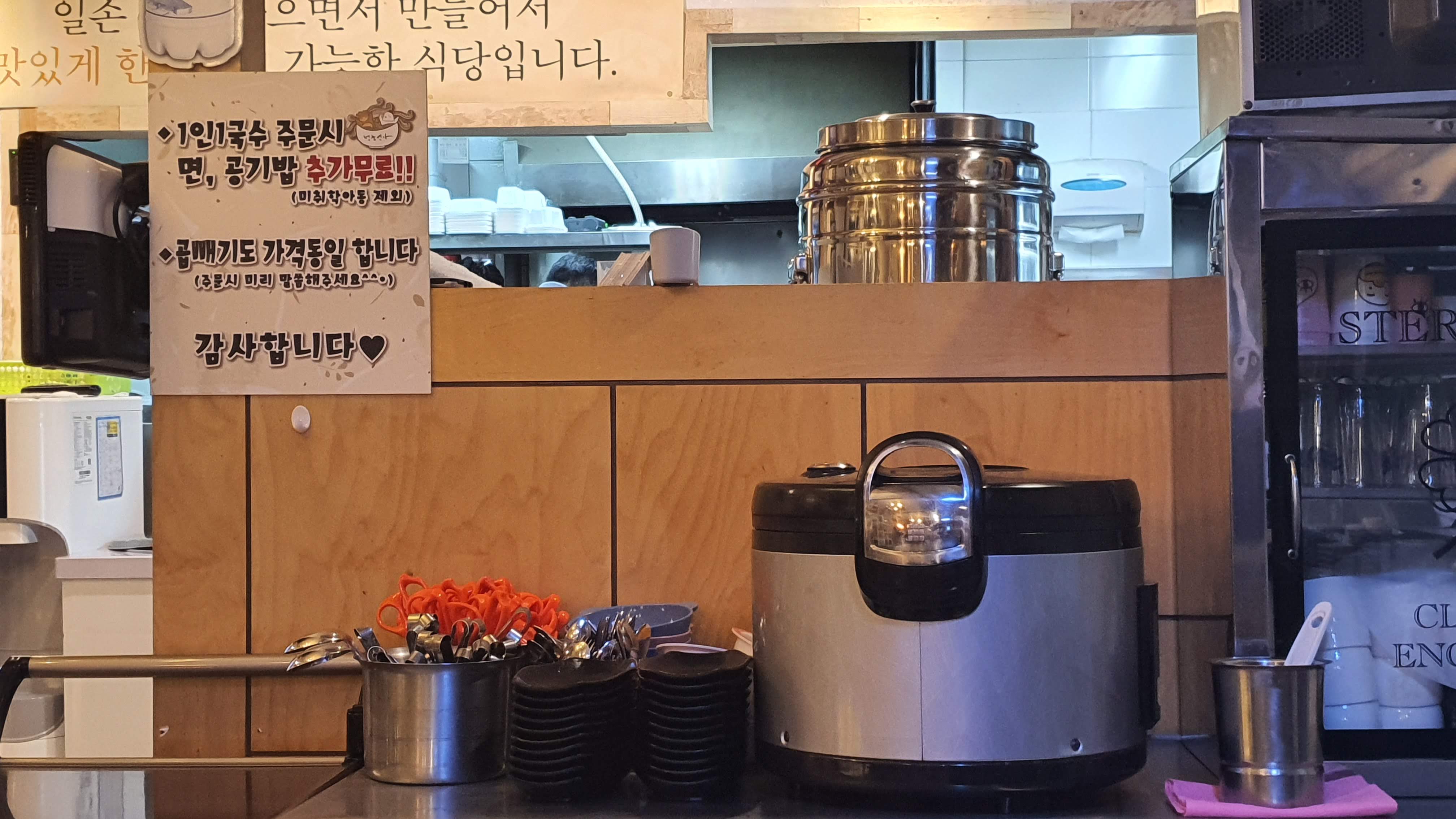양도 푸짐한데요. 1인 1 국수 주문 시에는 면, 공기밥이 무료예요.