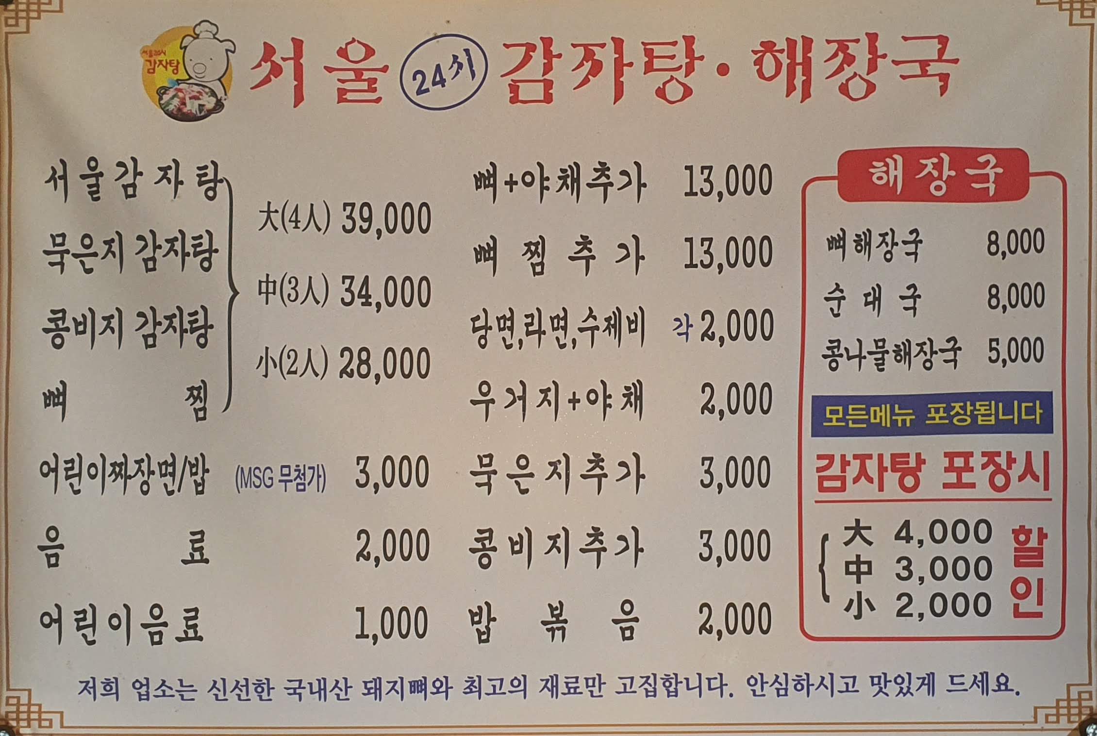 서울 24시 감자탕에서는 국내산 돼지뼈와 직접 담근 묵은지, 깍두기, 겉절이를 사용한데요^^