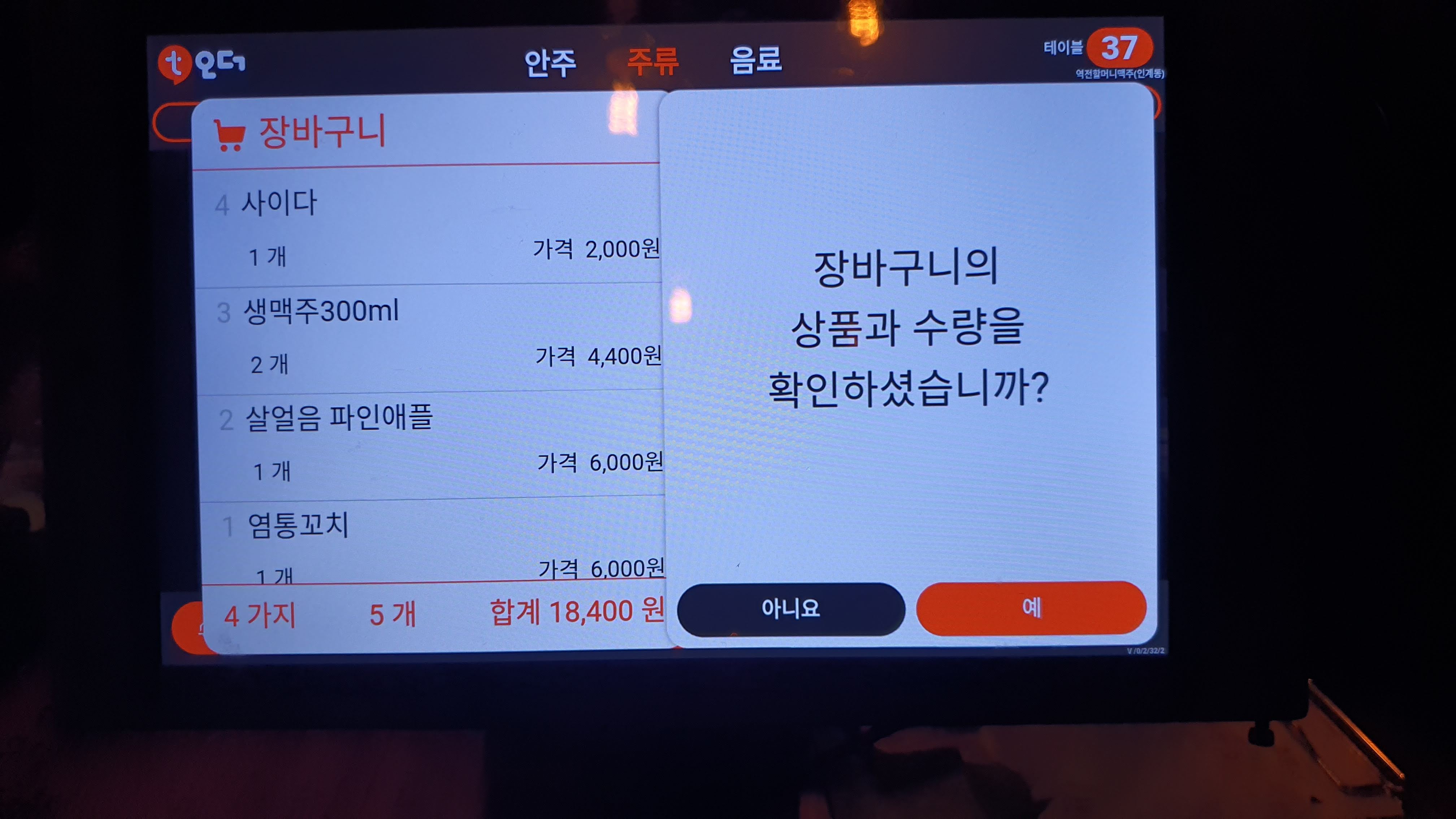 주문은 먹고 싶은 안주들과 술을 선택하여 장바구니에 담아요.