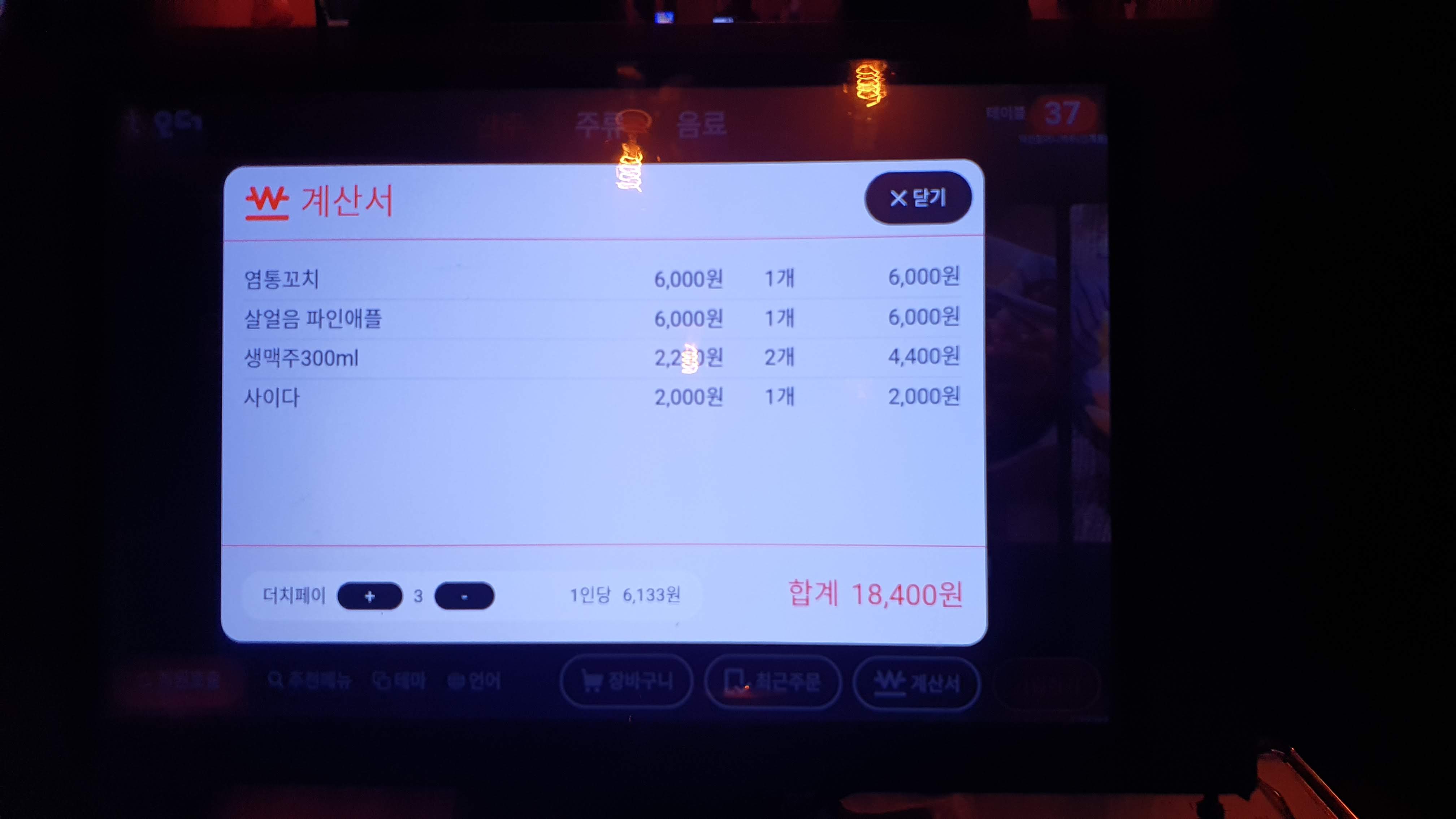 계산서에서 금액을 확인할 수 있는데요. 콩냥이 친구들과는 항상 더치페이를 생활화되어 있는데요.