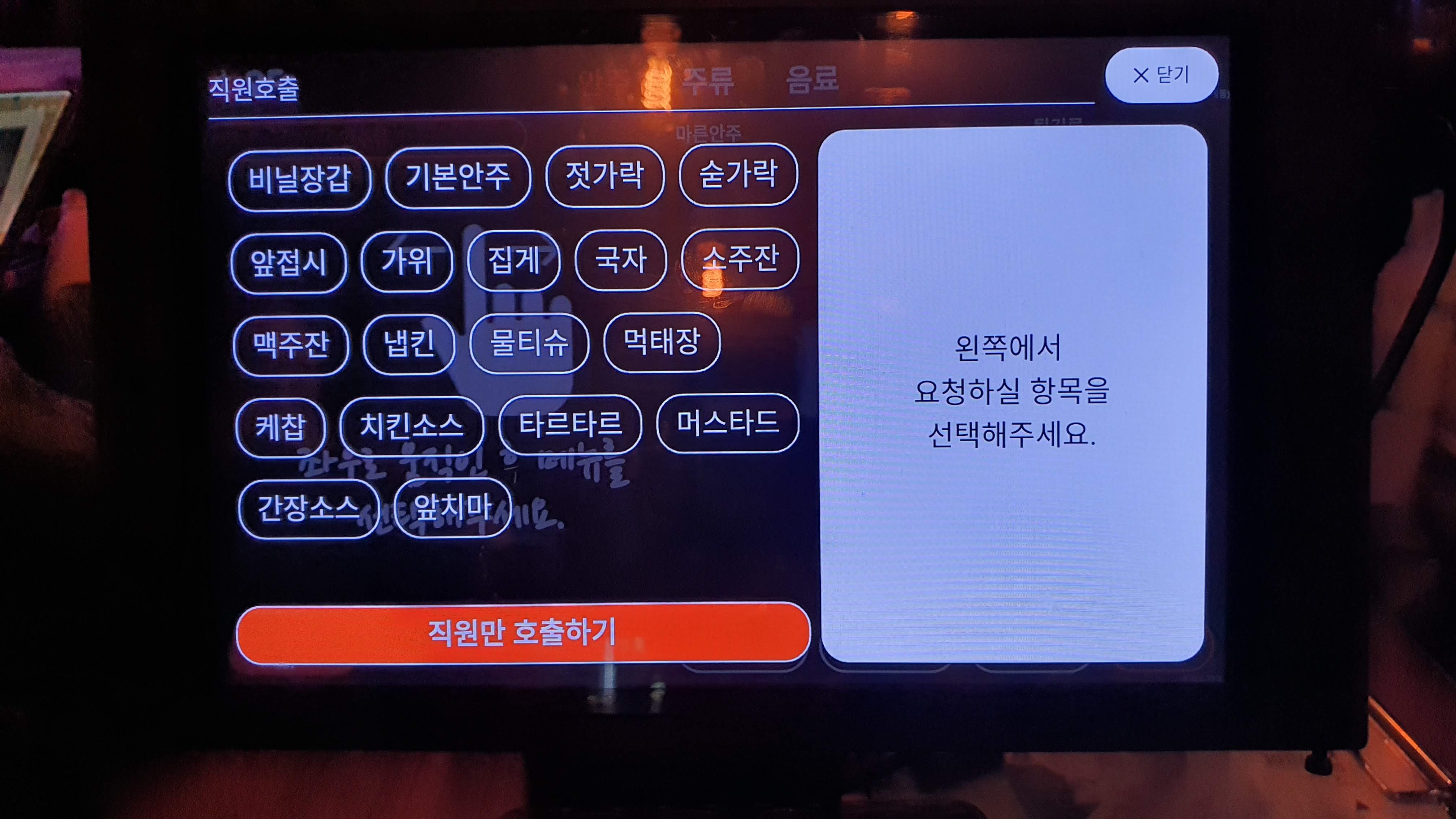 필요한 것이 있으면 선택을 하면 가져다주세요^^ 별도로 직원 분만 호출할 수도 있어요. ㅎㅎ