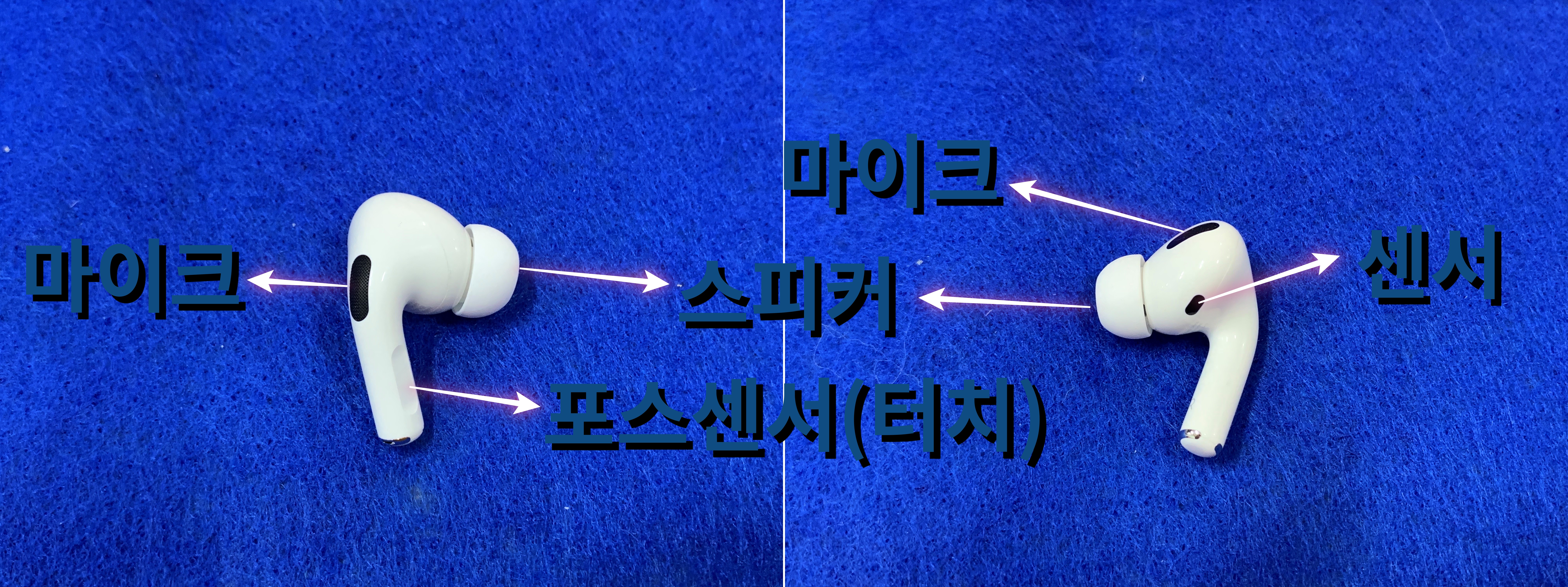 에어팟 프로를 꺼내서 살펴 봤어요.(아래 사진은 제가 판단하는 구성이에요.)저거 하나만 찍은건데 돌려서 찍은 거잖아요 ㅎㅎ